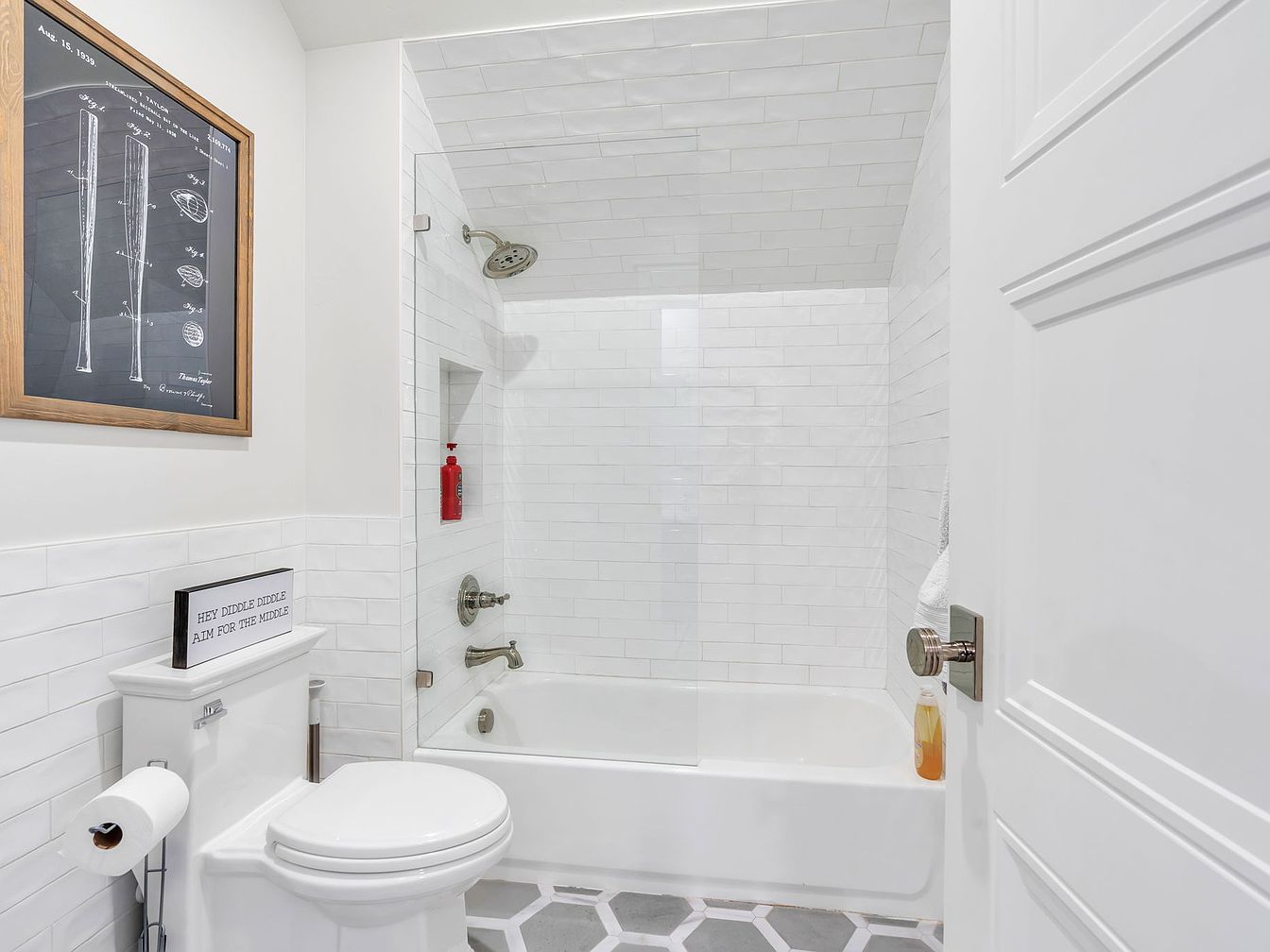 This modern bathroom features a sleek and functional layout, blending style with practicality. White subway tiles grace the walls, extending to the shower area, while a contemporary glass panel creates a spacious feel. The hexagonal floor tiles bring a unique geometric touch, complementing a clean and minimalistic aesthetic. A stylish white vanity, complete with a vintage mirror frame, adds warmth, while the framed artwork enhances the charm. Family-friendly features include a deep tub for relaxation and easy-clean surfaces. With soft lighting and neutral tones, this serene space offers a refreshing retreat perfect for unwinding after a busy day.