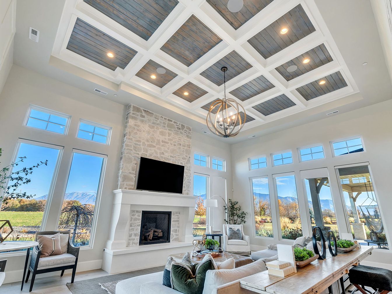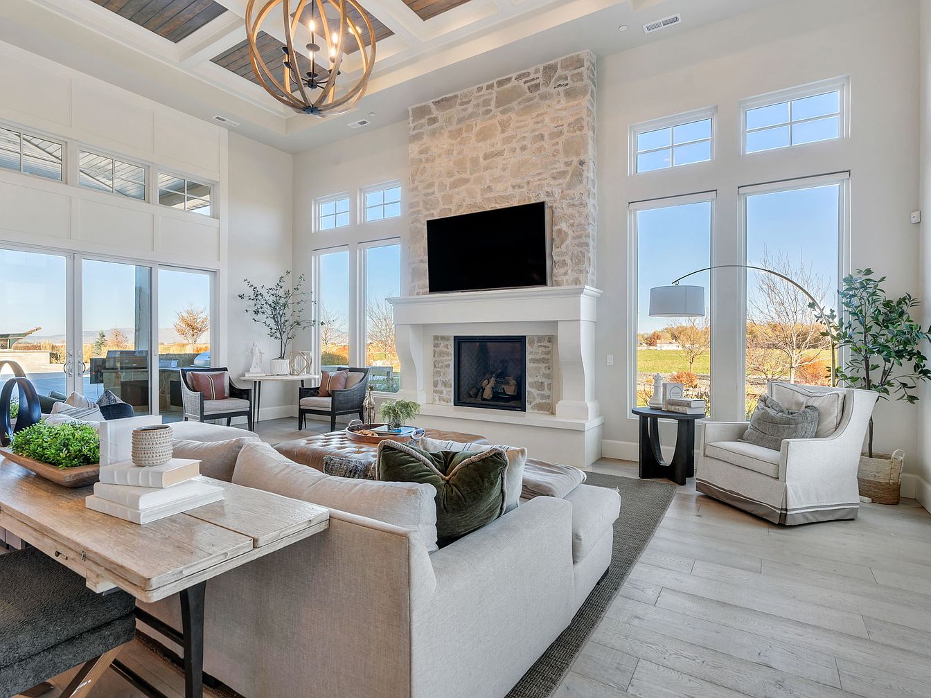 This spacious living room features an open layout with a breathtaking view through expansive windows, flooding the area with natural light. The elegant coffered ceiling adds depth and sophistication, while a stunning stone fireplace serves as the focal point, enhancing warmth and coziness. Neutral tones of soft whites and grays create a serene atmosphere, complemented by plush furnishings and tasteful decorative accents. The furniture arrangement encourages family interactions, with a coffee table at the center, perfect for gatherings. Ingenious architectural details and carefully selected decor resonate with modern farmhouse charm, making it an inviting and family-friendly haven.