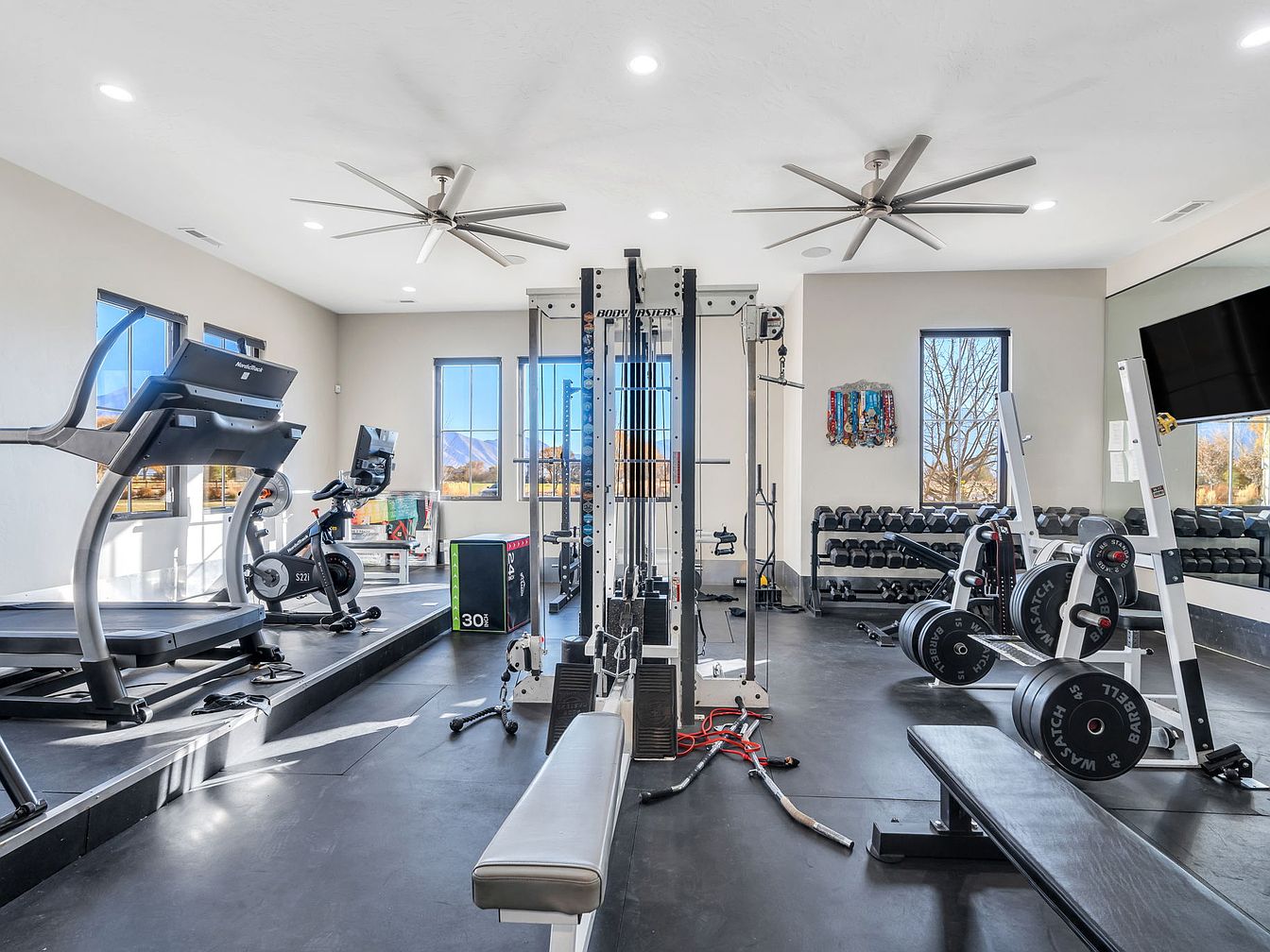 This spacious home gym features an open layout with large windows that flood the area with natural light, creating an inviting and energetic atmosphere. Equipped with state-of-the-art fitness equipment, including treadmills, exercise bikes, and weightlifting stations, it caters to all fitness levels. The sleek, dark flooring contrasts beautifully with the neutral wall colors, while modern ceiling fans ensure optimal airflow. Family-friendly amenities, such as a multi-functional weight machine and ample storage for equipment, encourage an active lifestyle. The room is adorned with motivational wall art and a TV for entertainment, making workouts enjoyable and engaging.