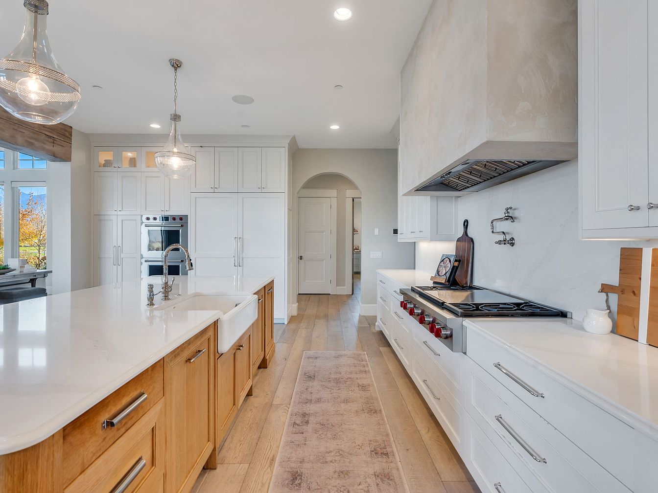 This spacious kitchen features an inviting layout with a central island that serves as both a workspace and a social hub. The combination of warm wooden cabinetry and sleek white countertops creates a harmonious aesthetic. Stylish pendant lights illuminate the area, while large windows ensure ample natural light floods in, enhancing the airy feel. Modern appliances, including a professional-grade range, add a sophisticated touch, catering to family cooking needs. The light wood flooring complements the contemporary design, and decorative accents, like a charming rug and tasteful kitchenware, contribute to a welcoming atmosphere perfect for family gatherings and entertaining.