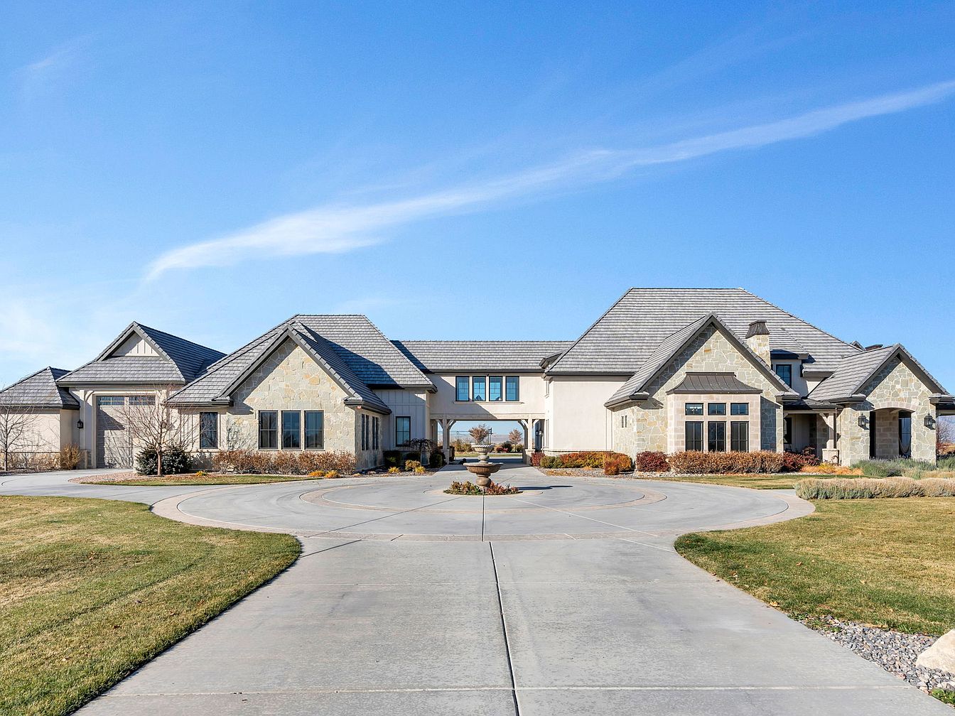 This striking American home features a sprawling layout with architectural elegance, nestled amidst expansive green pastures. The exterior showcases a stunning combination of stone and stucco, complemented by a distinctive multi-gabled roof. Solar panels and large windows emphasize energy efficiency while flooding the space with natural light. A meticulously landscaped yard, complete with circular driveway and gentle curves of manicured grass, invites families to enjoy outdoor activities. The harmonious color palette of soft earth tones creates a warm, inviting atmosphere, offering an idyllic retreat that balances modern amenities with a classic aesthetic, ideal for family gatherings and relaxation.
