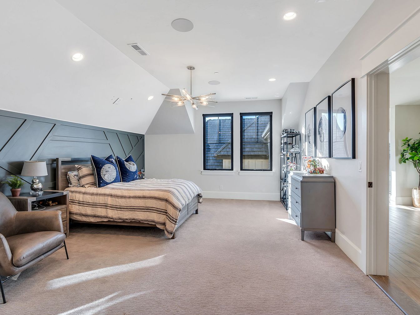 This master bedroom emanates a tranquil atmosphere with its spacious layout and cozy design elements. The sloped ceiling adds architectural interest, complemented by a stylish accent wall featuring intricate paneling. Soft beige carpeting enhances comfort, while large windows invite natural light and offer scenic views. The color scheme blends calming neutrals with deep blues in decorative pillows, fostering a serene vibe. Sleek furniture, including a modern dresser and a cozy armchair, promotes functionality and relaxation. Thoughtful details like contemporary lighting and potted greenery provide a warm and inviting space, perfect for unwinding or recharging.