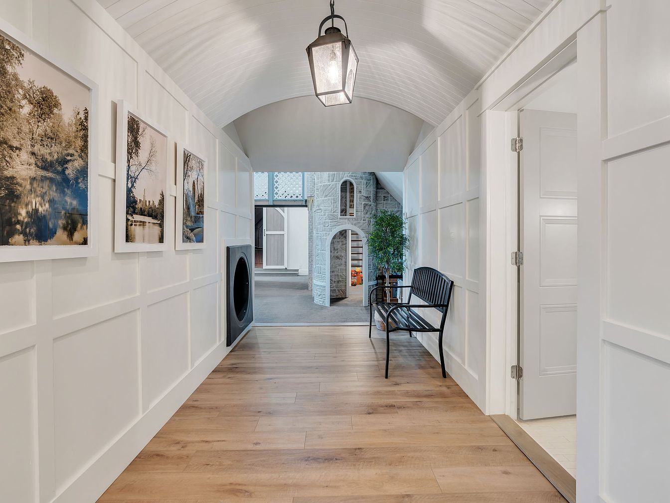 This inviting entrance hallway features a smooth, vaulted ceiling that enhances the spacious feeling. The combination of warm wood flooring and white wainscoting creates a sophisticated yet cozy atmosphere. Framed black-and-white photographs decorate the walls, adding a touch of artistic flair. A classic black bench offers a resting spot, perfectly positioned against the backdrop of this stylish entryway. To the left, a spacious doorway opens to a charming play area adorned with a faux stone castle structure, exemplifying family-friendly design. This area promotes both functionality and imaginative play, making it a striking focal point for children and guests alike.