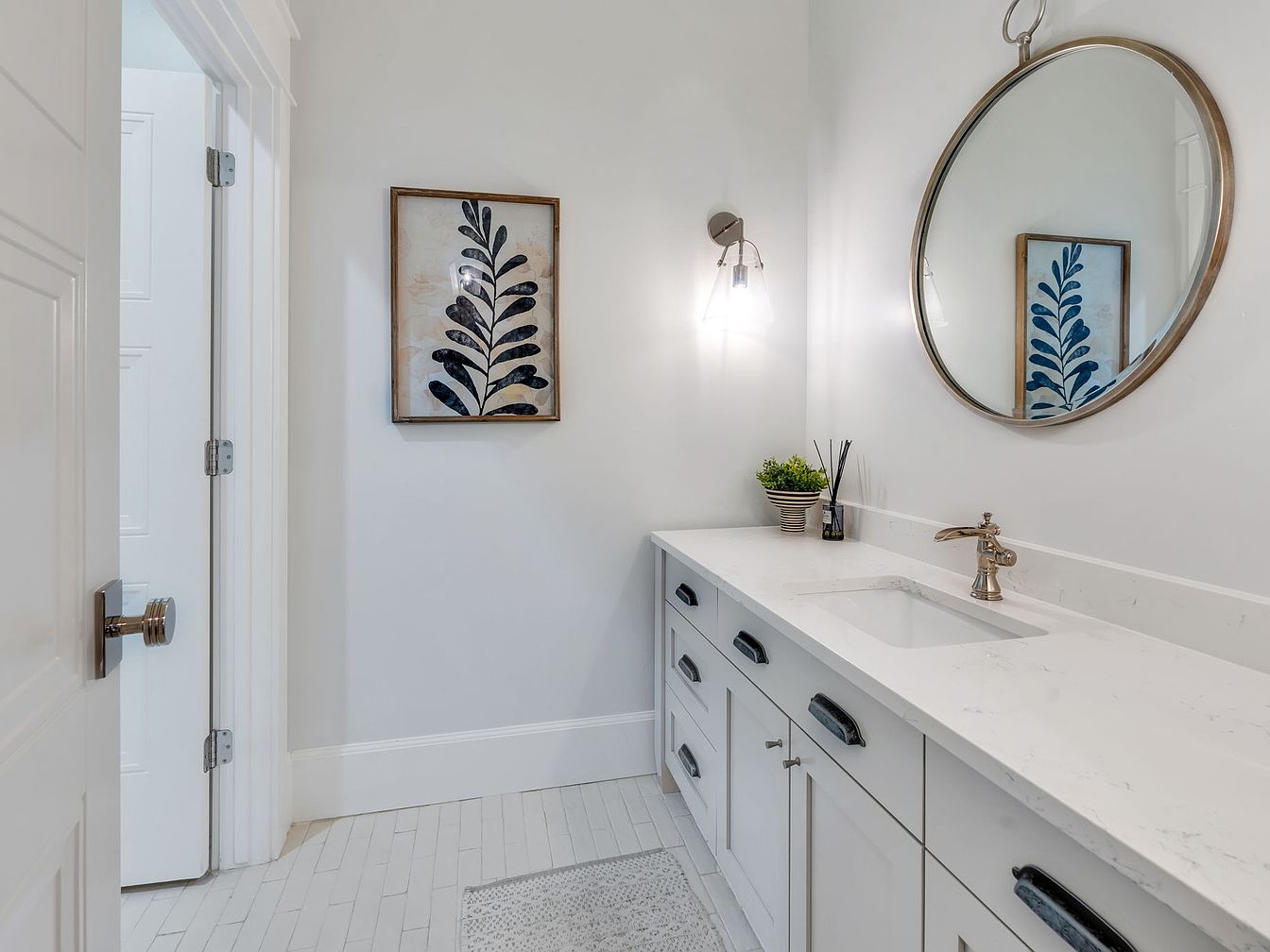 This stylish bathroom features a clean and modern design, characterized by its crisp white walls and elegantly patterned herringbone floor. A spacious countertop offers ample room for toiletries, complemented by sleek black hardware on cabinetry. The round mirror enhances the open feel, while a tasteful wall sconce adds warm lighting for everyday routines. A framed botanical print brings a touch of nature indoors, balanced by a potted plant that adds a refreshing vibe. With its family-friendly layout and thoughtful details, this space is perfect for both relaxation and functionality, making it a serene retreat in the home.