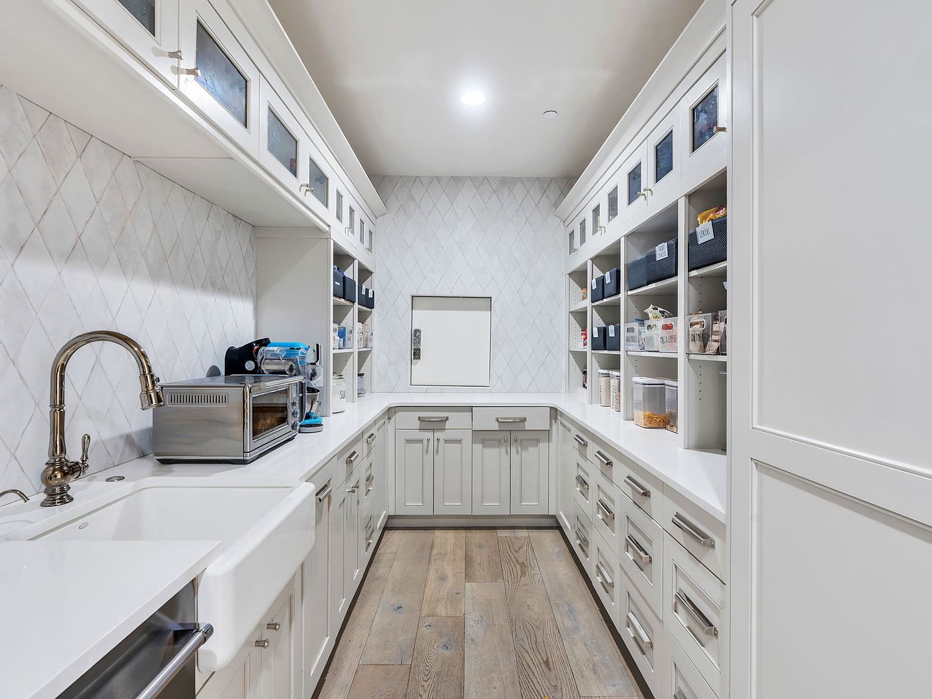 This beautifully designed pantry features a sleek, organized layout with ample storage solutions. The white cabinetry and countertops create a bright, airy atmosphere, while the herringbone-patterned backsplash adds an elegant touch. The combination of modern appliances, including a microwave and coffee maker, enhances functionality, making it ideal for busy family life. Open shelving with decorative baskets provides easy access to frequently used items while maintaining a tidy appearance. With its durable wood flooring and polished fixtures, this pantry blends style with practicality, ensuring that every culinary need is met while remaining visually pleasing.