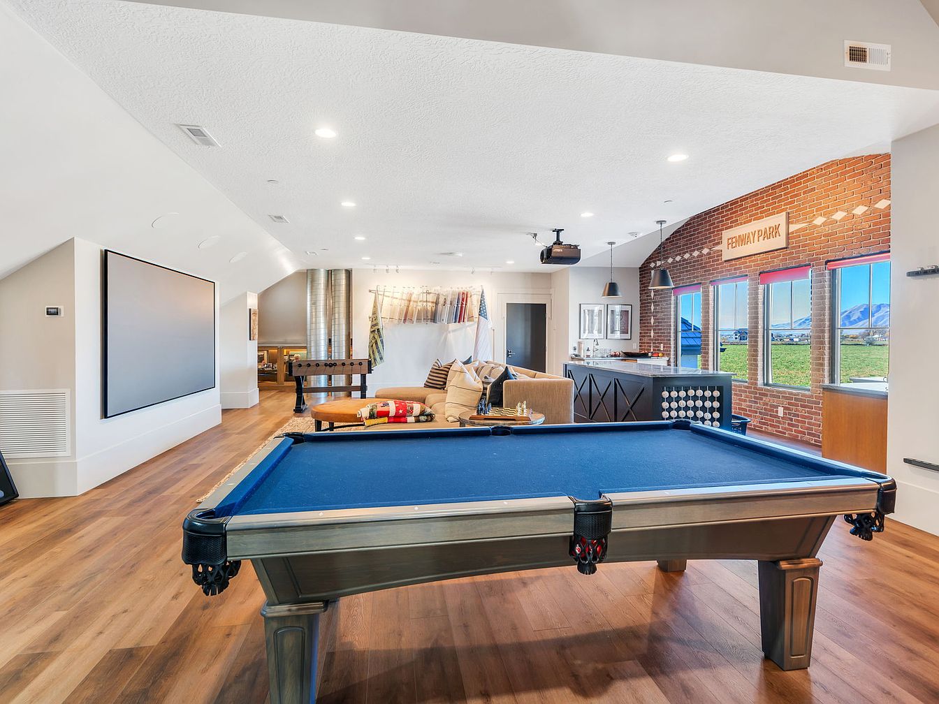 This spacious game room combines fun and relaxation, perfect for family gatherings. The central blue felt pool table adds a pop of color and serves as an inviting focal point. Warm wood flooring creates a cozy atmosphere, complemented by the soft tones of the furnishings. Large windows flood the space with natural light, offering scenic outdoor views. A stylish wet bar in the back enhances entertainment options, while the exposed brick wall introduces a modern industrial flair. Comfortable seating, playful decor, and an open layout ensure this room is both family-friendly and perfect for entertaining friends.