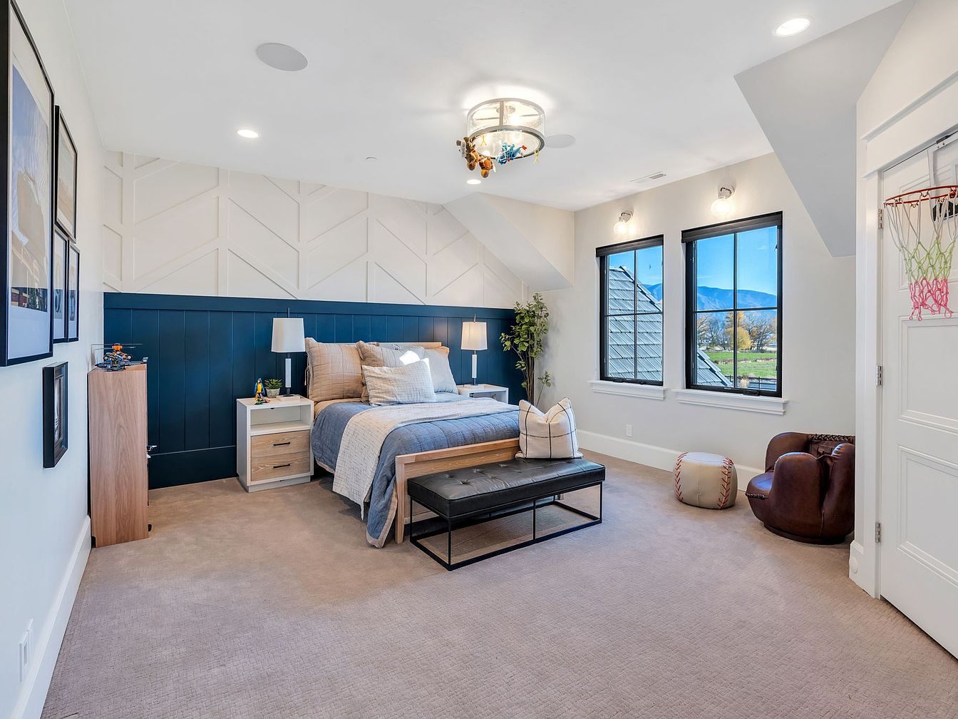This serene master bedroom combines elegance with family-friendly features, showcasing a plush carpet and cozy layout. A striking two-tone color scheme merges deep navy blue wainscoting with light-colored walls, contributing to a calming atmosphere. The room boasts a comfortable king-sized bed adorned with soft, layered textiles and decorative pillows, seamlessly complemented by stylish side tables with matching lamps. Large windows invite natural light and frame picturesque views, while architectural elements like sloped ceilings and chic light fixtures add character. Cozy seating options, including a bean bag chair and a unique pouf, create a welcoming space for relaxation and play.