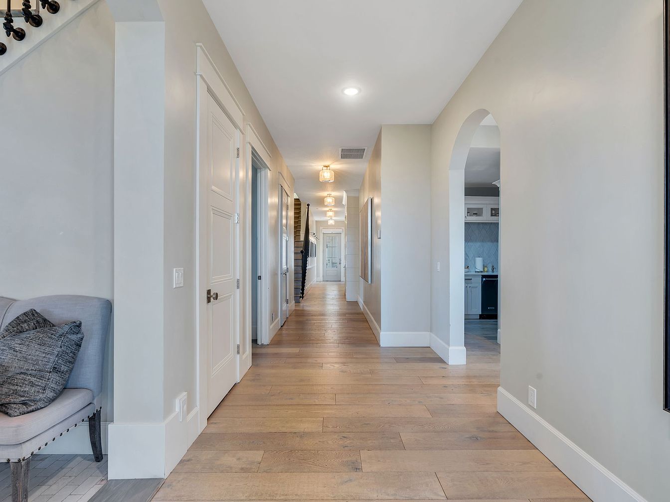 A welcoming entryway graced with warm hardwood flooring sets the stage for this modern home. Neutral, light gray walls offer a tranquil backdrop, enhanced by stylish hanging light fixtures that guide the eye down the corridor. An elegant archway leads to the kitchen, while doors line either side, hinting at private spaces beyond. A charming accent chair with decorative pillows invites guests to pause, creating a cozy nook. The open layout promotes a seamless flow throughout, ideal for family gatherings. Overall, this entryway balances function and aesthetic, embodying both warmth and contemporary charm.