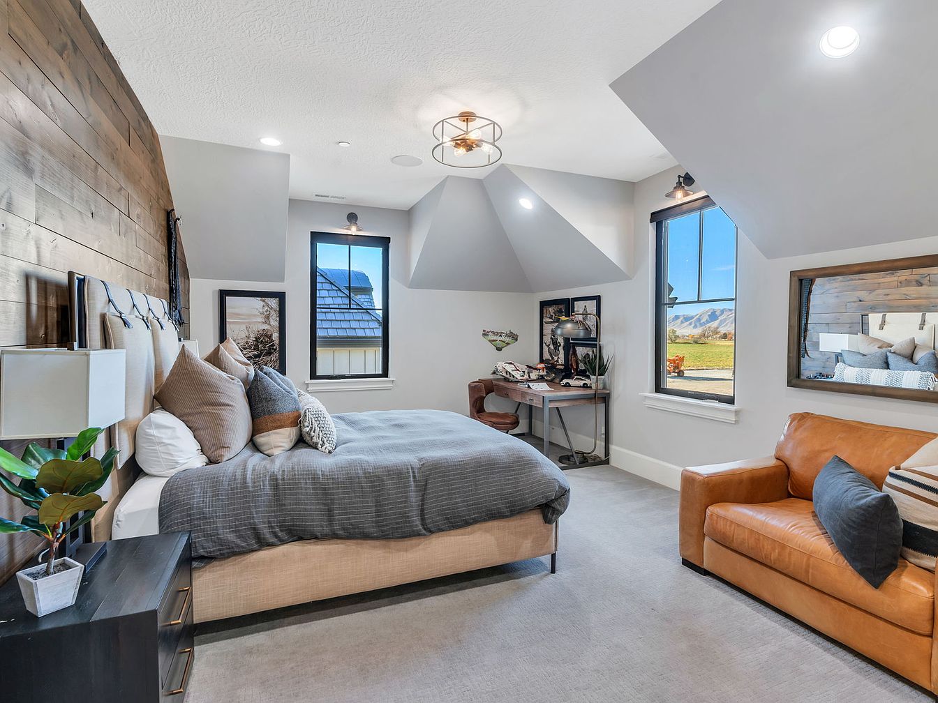 This inviting master bedroom features a cozy layout with a plush bed adorned in grey and beige tones, complemented by an array of textured pillows. A stunning accent wall of warm wood adds depth and character, enhancing the rustic charm. Sunlight streams through large windows, highlighting the spaciousness and offering picturesque views of the outdoors. An inviting leather sofa provides a perfect reading nook, while a sleek desk area encourages productivity. The soft carpeting contributes to a comfortable atmosphere, perfect for relaxation. Modern lighting fixtures blend functionality with style, making this space both stylish and family-friendly.