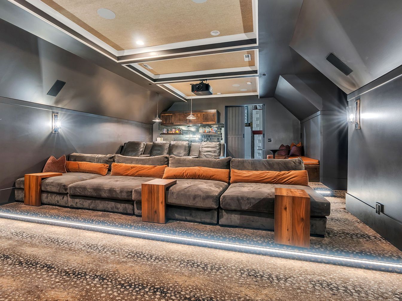 This home theater combines comfort and sophistication, featuring a spacious sectional sofa adorned with warm orange accents. The layout promotes relaxation, with plush seating that encourages family gatherings for movie nights. Walls in deep tones create an inviting atmosphere, complemented by soft ambient lighting hidden along the baseboards. Architectural details, such as the coffered ceiling and recessed lighting, enhance the dramatic effect, while a stylish bar area adds convenience for refreshments. The thick, textural carpeting not only absorbs sound but also feels luxurious underfoot, making this a perfect family-friendly cinema escape.