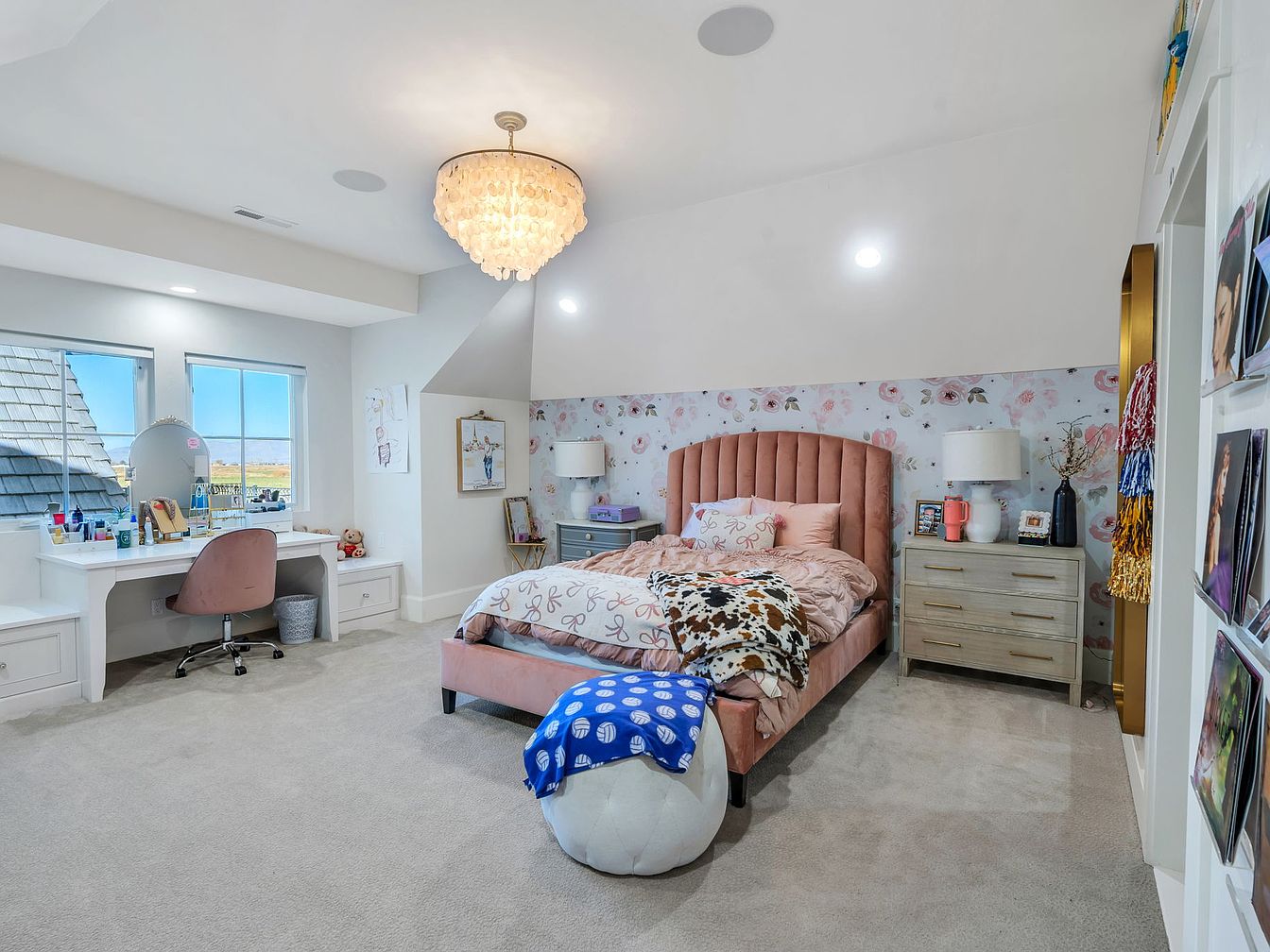 This delightful kid’s bedroom exudes charm and warmth, designed for comfort and creativity. The room features a soft pink upholstered bed with decorative pillows, creating a cozy center point. Above, a stunning chandelier adds a touch of elegance, while playful floral wallpaper enhances the cheerful atmosphere. A spacious desk area with a plush chair and ample natural light from large windows encourages study and creativity. The neutral carpet underfoot provides warmth and comfort, making it family-friendly. Accessories like a stylish nightstand and decorative photos add personal flair, making this space a perfect retreat for any child.