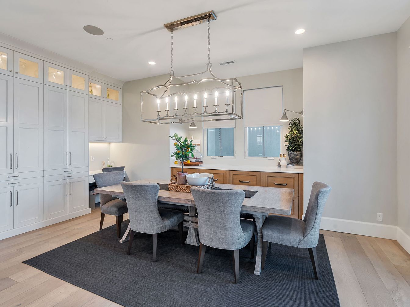 This spacious dining area features a contemporary design seamlessly integrating functionality and aesthetic appeal. A rustic table made of natural wood serves as the centerpiece, surrounded by plush, upholstered chairs that invite long, comfortable meals. The modern chandelier overhead adds an elegant touch, casting warm light across the room. Neutral tones dominate the color scheme, with soft grays and creamy whites creating a serene atmosphere. Ample cabinetry provides practical storage, while stylish glass-front displays enhance visual interest. Large windows allow natural light to flow in, making this area perfect for family gatherings and entertaining guests.