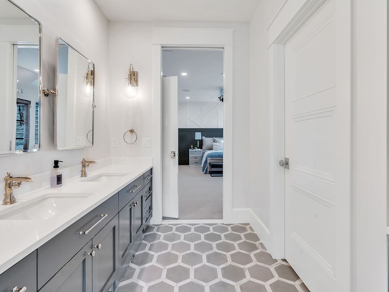 This master bathroom radiates sophistication and functionality, featuring dual vanities that provide ample space for busy mornings. The striking navy cabinetry complements the crisp white countertops, while polished gold fixtures add a touch of luxury. A hexagon-patterned tile floor enhances the visual interest of the room, blending modernity with enduring style. Natural light pours in through the spacious doorway that leads to the bedroom, creating an inviting atmosphere. Carefully selected accessories and generous mirrors amplify the sense of space, making this bathroom not just a retreat for self-care, but also a beautiful focal point of the home.