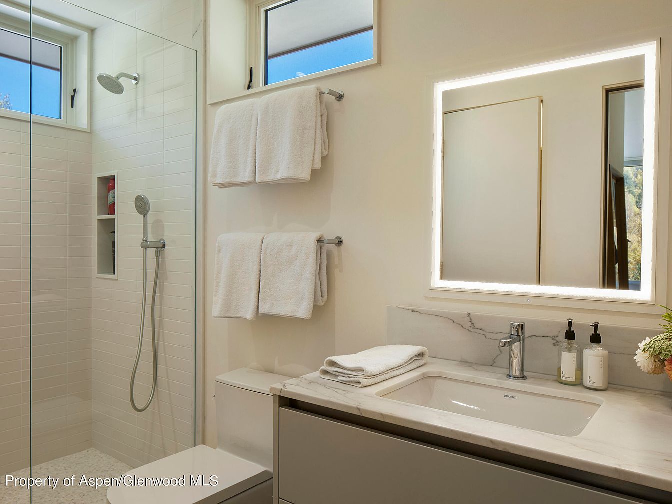 This modern bathroom features a sleek layout highlighted by a spacious walk-in glass shower with dual showerheads and built-in shelving for convenience. The floating vanity is topped with elegant white marble, accented by chrome fixtures and a large illuminated mirror, creating a bright and inviting atmosphere. Soft, neutral tones dominate the space, enhancing its sense of calm and cleanliness. Double towel racks and ample counter space provide family-friendly functionality, making it easy to keep essentials organized. Natural light from two windows elevates the airy feel, making this bathroom both practical and aesthetically pleasing for daily family living.
