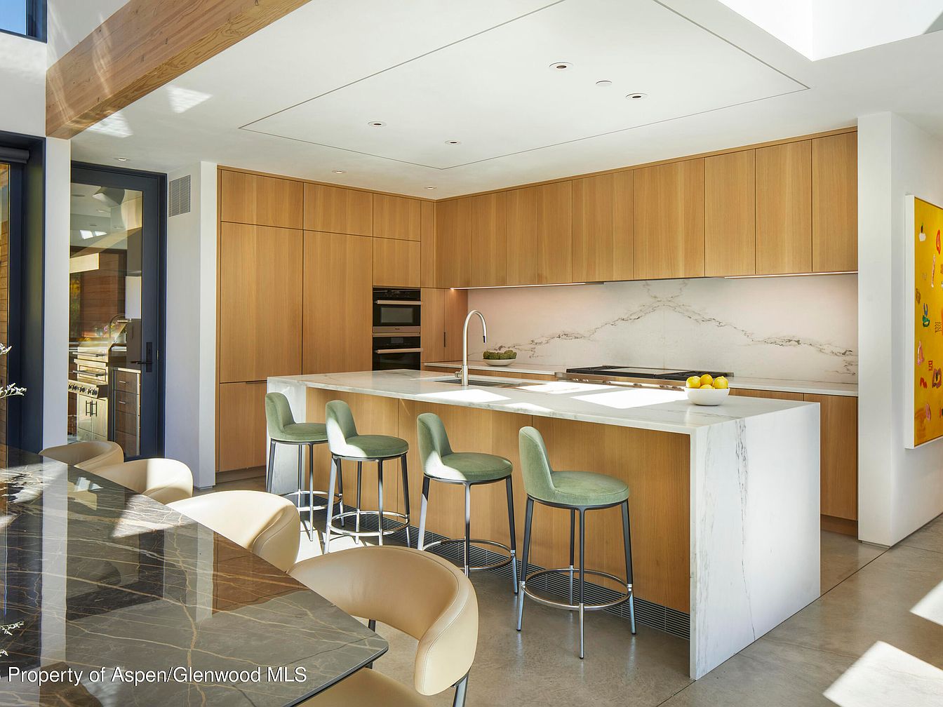 A bright, airy kitchen blends modern design with warmth through its natural wood cabinetry and sleek white marble surfaces. The spacious island, topped with elegant marble, invites family gatherings and casual meals, complemented by comfortable sage-green stools. Smooth, handleless cabinets provide ample storage, keeping the space clutter-free and kid-friendly. The open layout merges effortlessly with the adjacent dining area, featuring a sophisticated dark marble table and plush cream chairs. A minimalist aesthetic, neutral tones, and an abundance of natural light from a skylight above create a welcoming environment, perfect for both entertaining and daily family life.