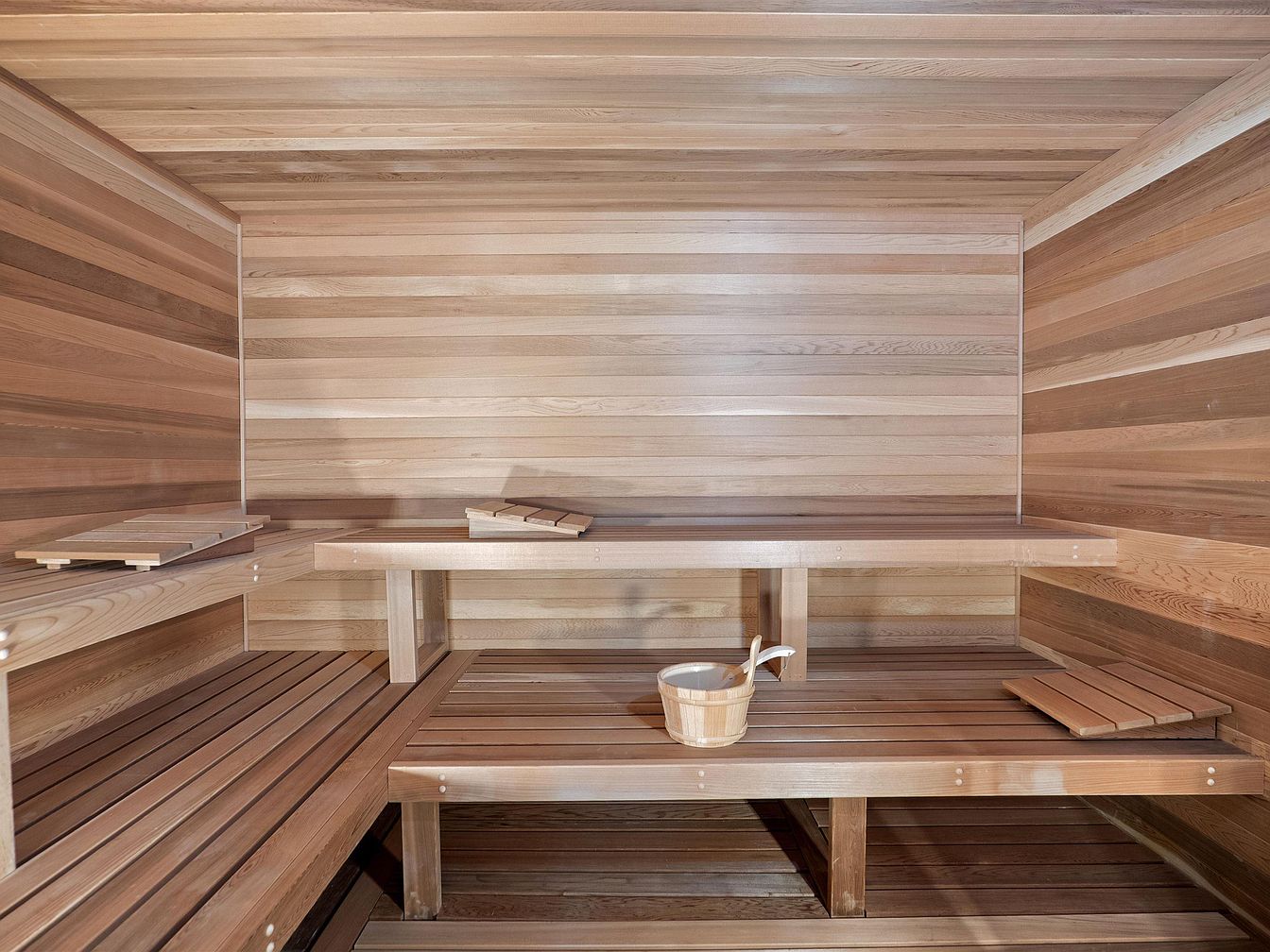 A tranquil home sauna designed with smooth horizontal cedar paneling, creating a warm and inviting ambiance perfect for relaxation and wellness. The tiered wooden benches provide ample seating for multiple family members, making it ideal for group bonding or solo reflection. The soft, golden hues of the natural wood enhance the soothing atmosphere, while the sturdy construction and simple lines give the space a timeless appeal. Thoughtful touches, like wooden headrests and a traditional water bucket with a ladle, highlight both comfort and authenticity, ensuring a luxurious yet family-friendly retreat right within your home.