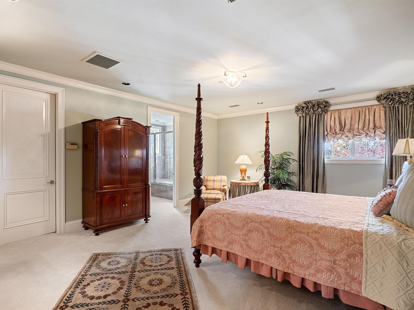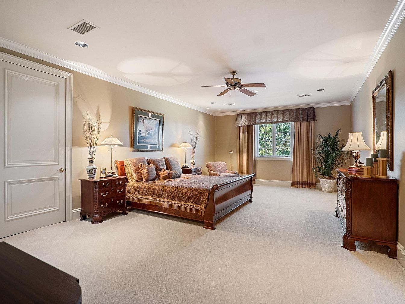 A spacious master bedroom designed for both relaxation and elegance, featuring plush carpeting and soothing beige tones throughout. The king-sized wooden sleigh bed is complemented by matching nightstands and a fine dresser, all finished in rich, dark wood for a cohesive, traditional look. Large windows invite abundant natural light and are dressed in tailored curtains with a valance, creating a soft, inviting ambiance. The room is finished with crown molding, a ceiling fan for comfort, and touches of greenery for freshness. The generous layout provides ample floor space, making it ideal for families seeking comfort and tranquility in their private sanctuary.