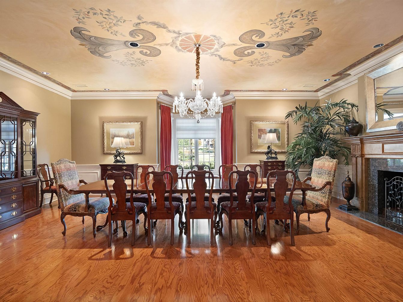 A spacious, elegant formal dining room designed for large family gatherings features a classic wooden table surrounded by carved high-back chairs. The rich hardwood floor complements the warm beige walls, which are adorned with traditional framed artwork and decorative lamps. An ornate chandelier hangs at the center, illuminating the space while drawing attention to the intricate hand-painted ceiling mural above. Large windows framed with sumptuous red curtains provide natural light and a welcoming atmosphere. Architectural touches like crown molding, wainscoting, and a grand fireplace with a decorative mantle add sophistication, while the presence of lush greenery and ample seating make it family-friendly and inviting.
