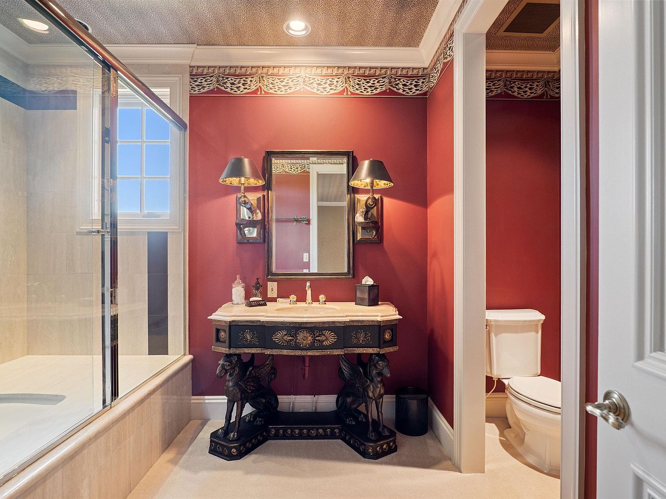 An elegant bathroom combines luxury and functionality with deep red walls, ornate crown molding, and decorative trim that create a sophisticated ambiance. The vanity makes a striking centerpiece, featuring intricate gold detailing, marble countertop, and sculptural base with carved animal figures, adding a touch of classic opulence. Dual wall sconces with black shades provide focused lighting and complement the mirror framed in black and gold. Natural light streams in from a window near the spacious glass-enclosed shower, enhancing the room’s welcoming feel. Neutral flooring and a standard white toilet complete the space, ensuring comfort and practicality for family use.
