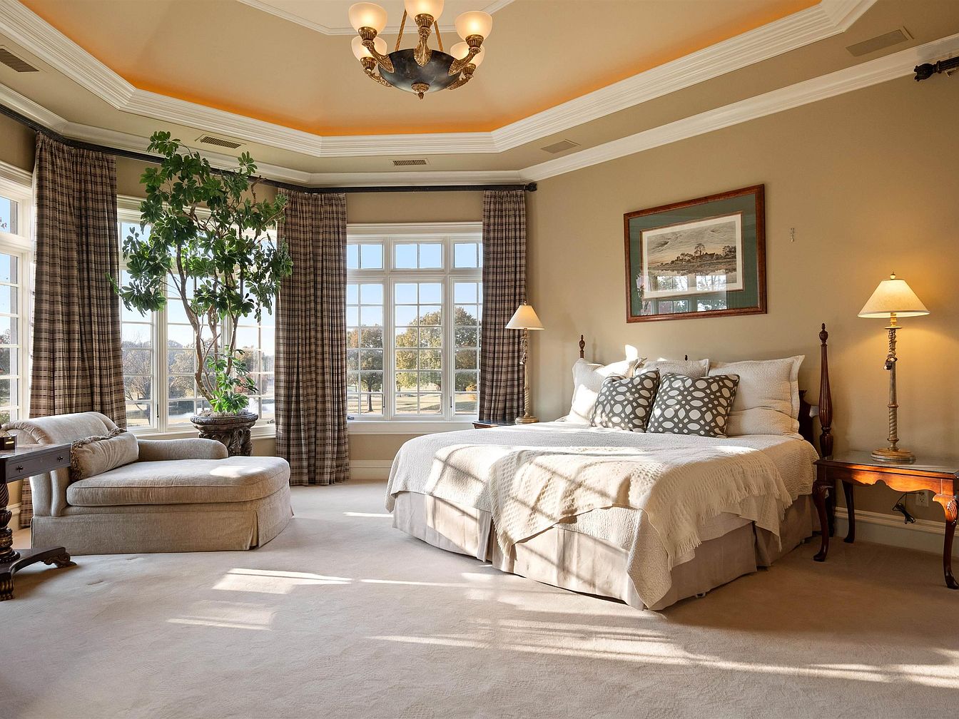 Spacious bedroom designed for comfort and relaxation, with large bay windows allowing natural light to flood the room and giving peaceful views of the outdoors. A neutral palette of warm beige walls and soft cream carpet creates a calming atmosphere, while the coffered ceiling with elegant chandelier adds character and sophistication. Family-friendly details include a cozy chaise lounge perfect for quiet reading, and ample floor space ideal for children to play. Classic wooden furniture, plush bedding with decorative pillows, and tasteful artwork contribute to an inviting, timeless aesthetic, making this an inspiring sanctuary for family living.