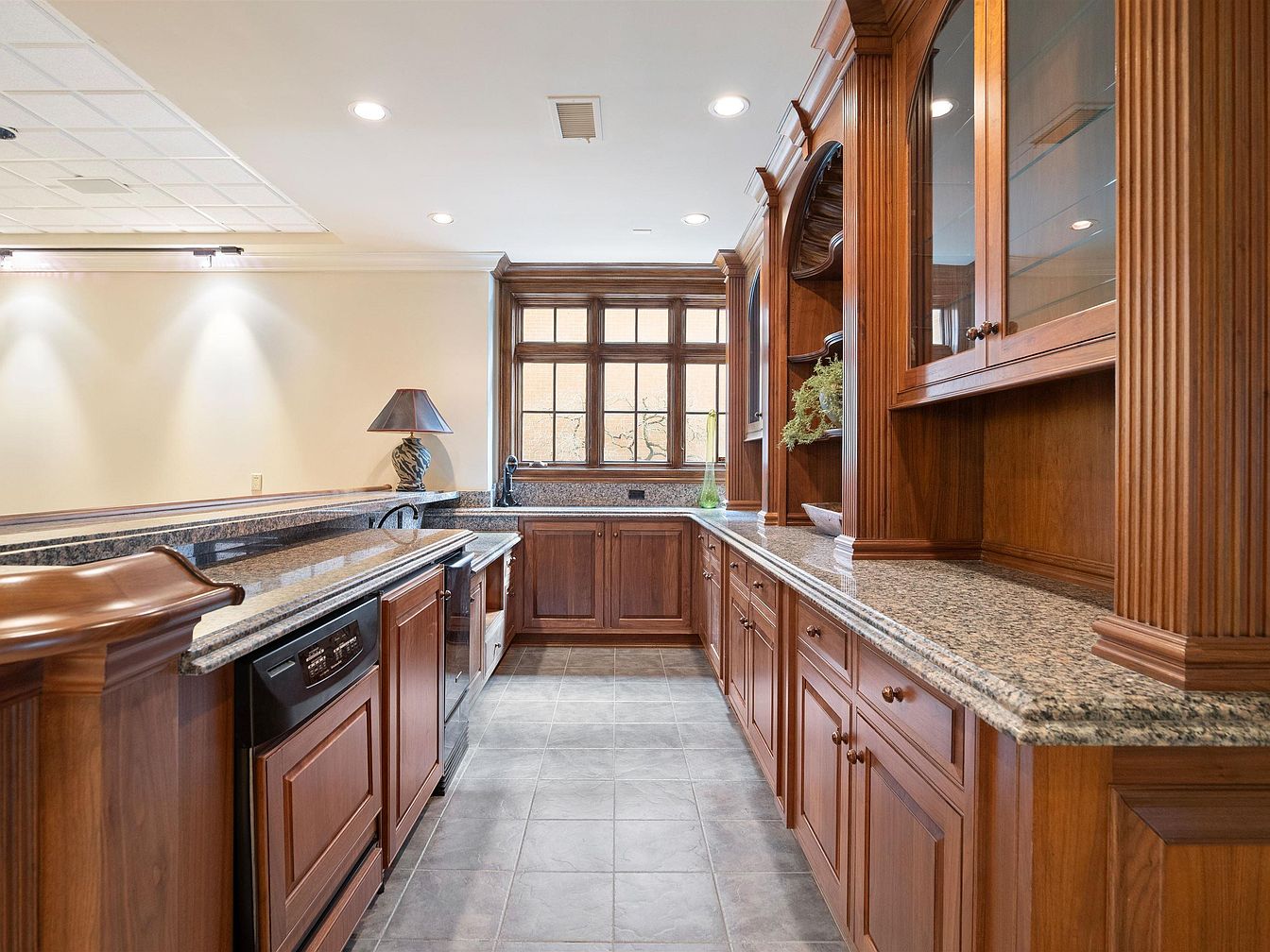 Warm wooden cabinetry with classic raised panels and fluted columns brings a touch of elegance to this spacious kitchen. Granite countertops offer ample workspace while easy-to-clean tile flooring ensures durability for active family life. A wide-set window above the sink fills the room with natural light, creating an inviting atmosphere for meal prep and gatherings. Glass-fronted upper cabinets provide stylish display space for glassware or cherished dishes. The peninsula offers casual bar seating, perfect for morning breakfasts or supervised homework sessions. Soft neutral walls and recessed lighting contribute to the kitchen’s bright and welcoming feel, making it a versatile hub for daily living.