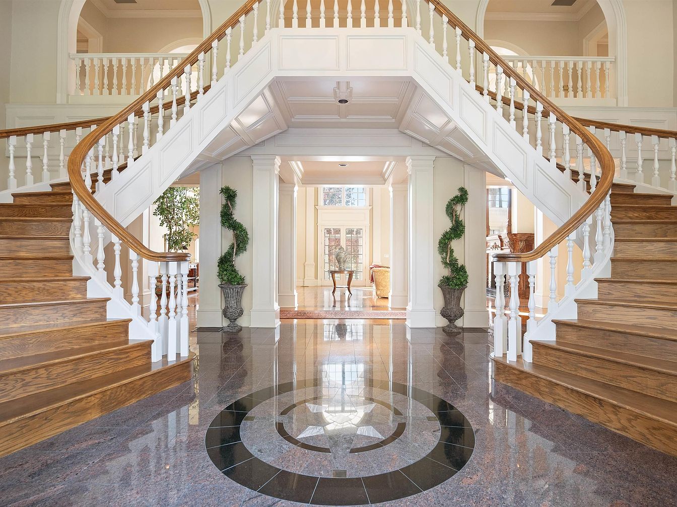 A stunning double staircase welcomes guests into a spacious foyer, setting a tone of luxury and warmth. Rich hardwood steps with elegant white balusters create an inviting ascent to the upper level. The glossy marble floor, detailed with a decorative circular inlay, adds timeless sophistication. Large decorative planters with topiary accents enhance a family-friendly atmosphere, combining formality and welcoming charm. Starburst natural light from tall windows brightens the soft cream walls, making the entrance feel airy and open. Visible adjoining rooms suggest an open-concept layout, ideal for entertaining and easy family flow throughout the home.