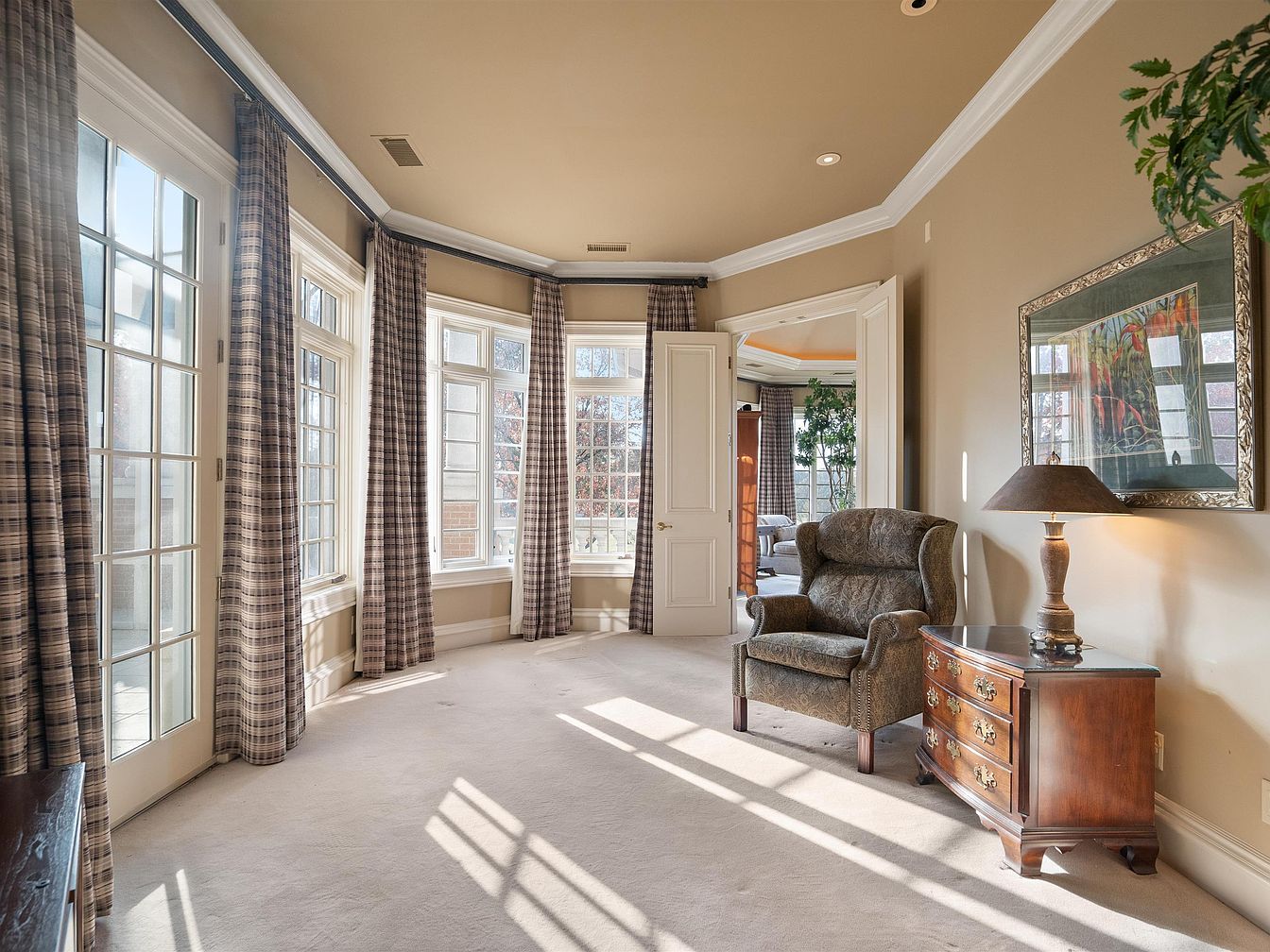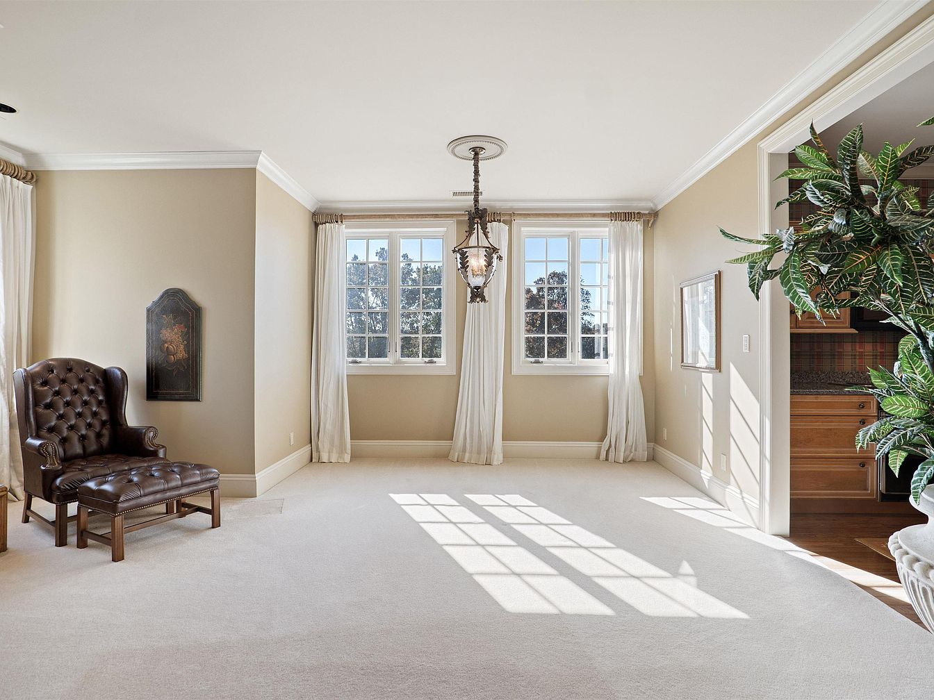 Abundant natural light fills this serene sitting room, where large, grid-pane windows overlook a lush exterior. Soft cream carpeting and warm beige walls create a tranquil and inviting ambiance, complemented by traditional crown molding and a classic chandelier as a focal point. A tufted leather armchair with a matching ottoman offers a cozy spot for relaxation or family reading time. The open layout flows seamlessly to an adjoining space, enhancing accessibility for families. Neutral tones, simple artwork, and lush indoor plants add understated elegance, while ample floor space makes it adaptable for play or gatherings, emphasizing both style and practicality.