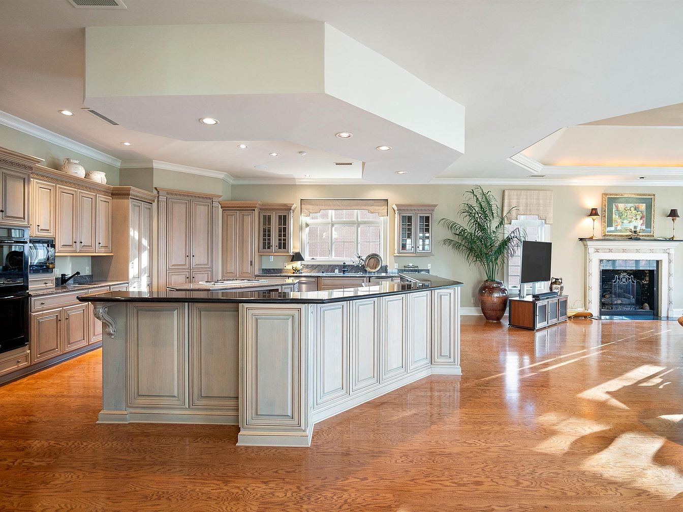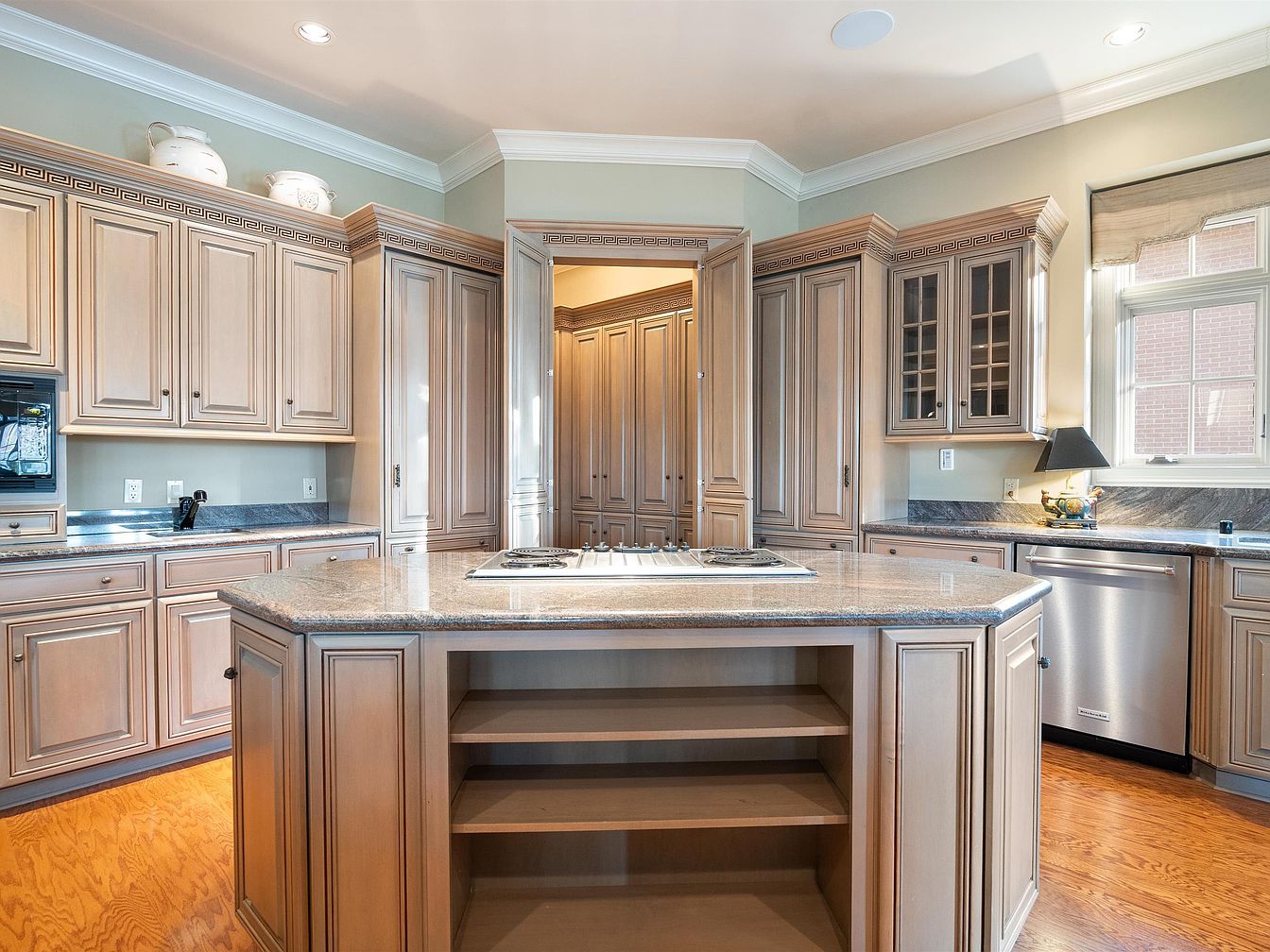 This spacious kitchen features a large central island with open shelving and a built-in cooktop, providing a family-friendly space for meal prep and casual gatherings. Surrounding the island, elegant cabinetry in warm beige tones offers ample storage and sophisticated detailing such as crown moldings and classic hardware. Stainless steel appliances blend seamlessly with granite countertops, creating a timeless yet modern look. Natural light floods the room through a large window above the sink, highlighting the gleaming hardwood floors and soft neutral wall color. Thoughtful lighting and the open layout make this kitchen both inviting and highly functional.