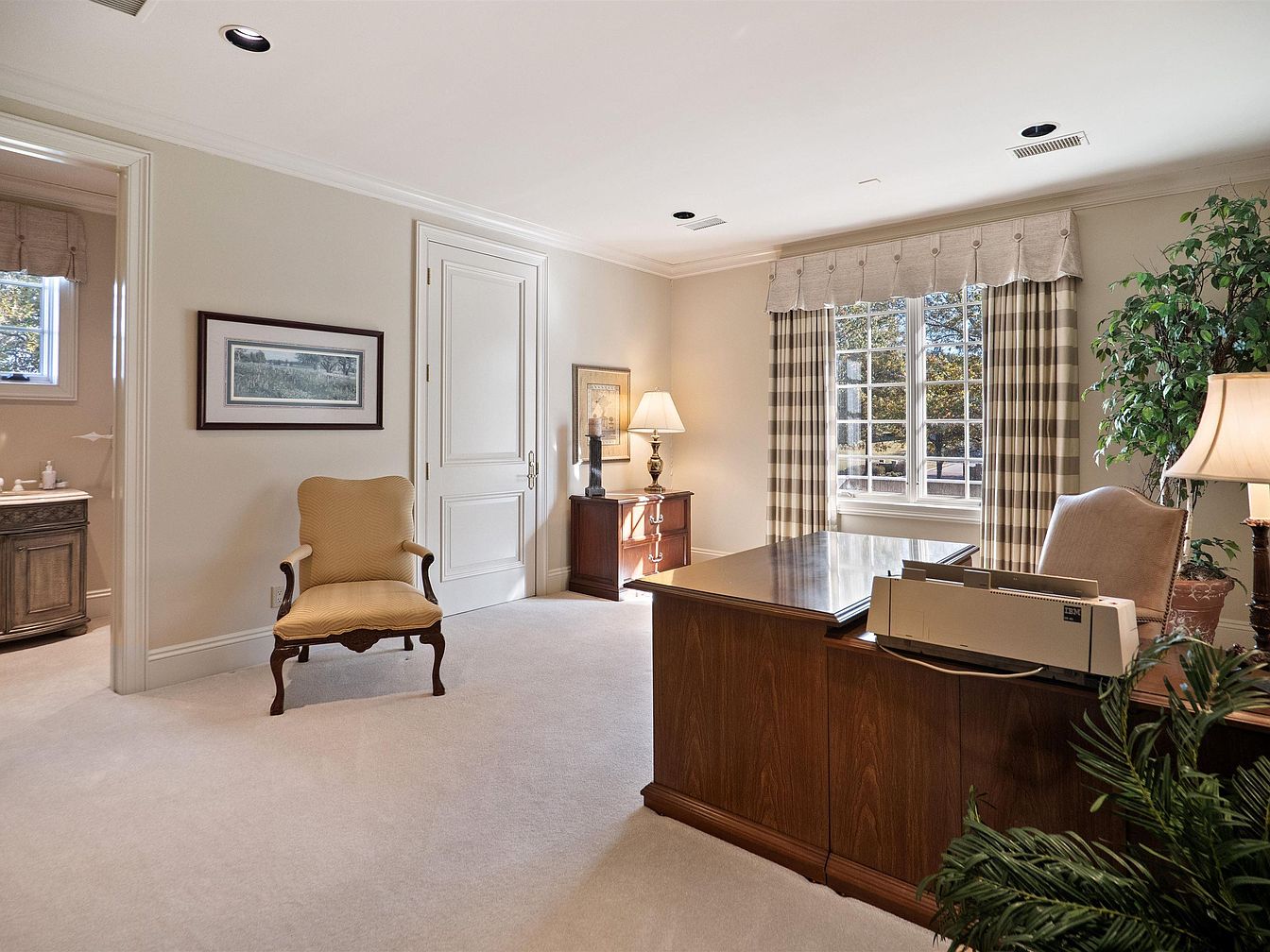 A spacious home office filled with natural sunlight streaming through a large window, framed by checked drapes with a tailored valance. The room is anchored by a polished wooden desk, complemented by a classic upholstered armchair and elegant side table with a decorative lamp. Soft beige carpet and neutral wall tones create a calming, welcoming ambiance perfect for productivity or family homework sessions. Thoughtfully chosen artwork and lush indoor plants bring a touch of comfort and personal style. A private bathroom nearby enhances convenience, making this an ideal multi-functional space for all family members.
