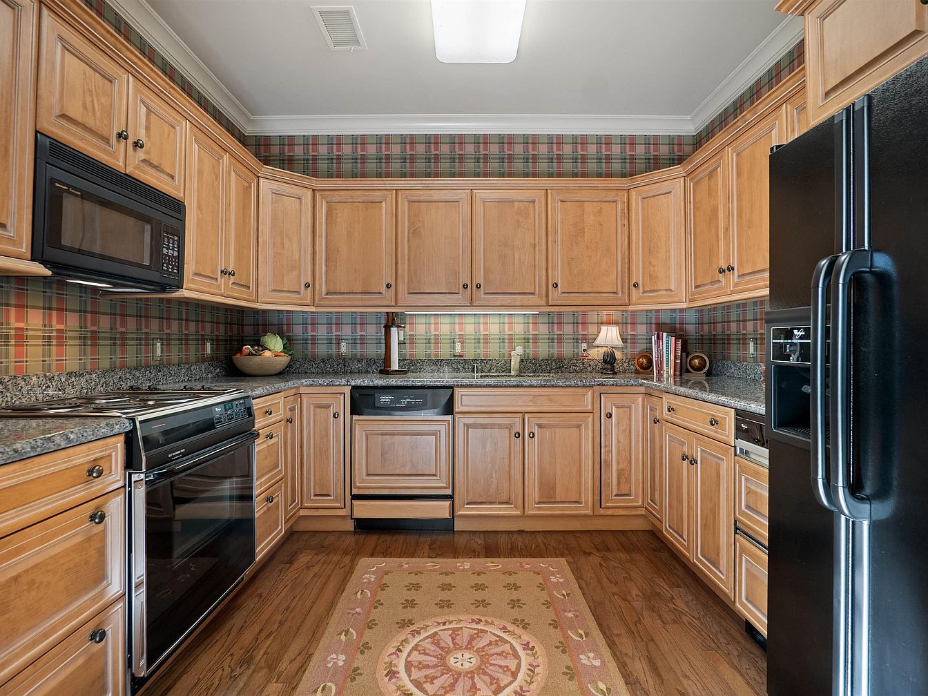 A warm and inviting kitchen space designed for both cooking and gathering. Natural wood cabinetry lines the walls, offering plentiful storage and a sense of solidity, while granite countertops provide ample workspace. The eye-catching plaid wallpaper adds a rustic touch and complements the honey-toned cabinets. Family-friendly features include a large refrigerator, built-in microwave, electric stove, and dishwasher for daily convenience. Soft lighting and decorative accents create a welcoming atmosphere, perfect for shared meals or homework sessions at the counter. A patterned area rug enhances comfort underfoot, and richly stained hardwood floors complete the homey, traditional appeal of this well-organized kitchen.