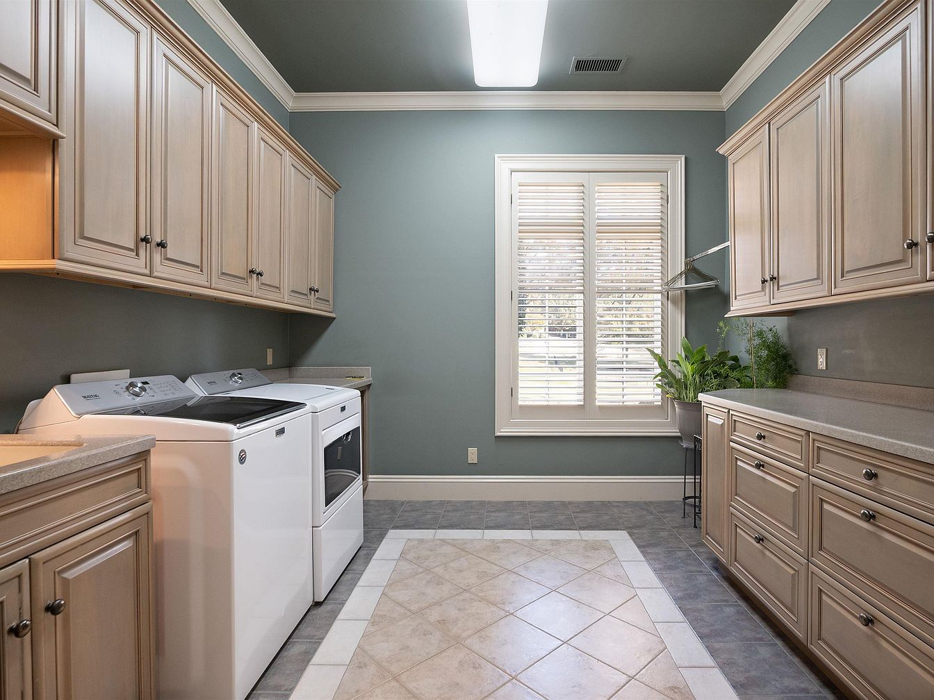 A spacious, inviting laundry room features a pair of modern washer and dryer appliances beneath generous upper cabinetry, offering ample storage for all laundry essentials. Soft blue-green walls pair harmoniously with light wood cabinets and neutral countertops, blending practicality with soft elegance. Large tile flooring, accented by a decorative border, ensures both durability and easy cleaning. Abundant natural light streams through plantation shutters, and a touch of greenery near the window adds freshness to the space. Expansive counters provide plenty of folding space, making this a highly functional and family-friendly area for managing everyday chores together.
