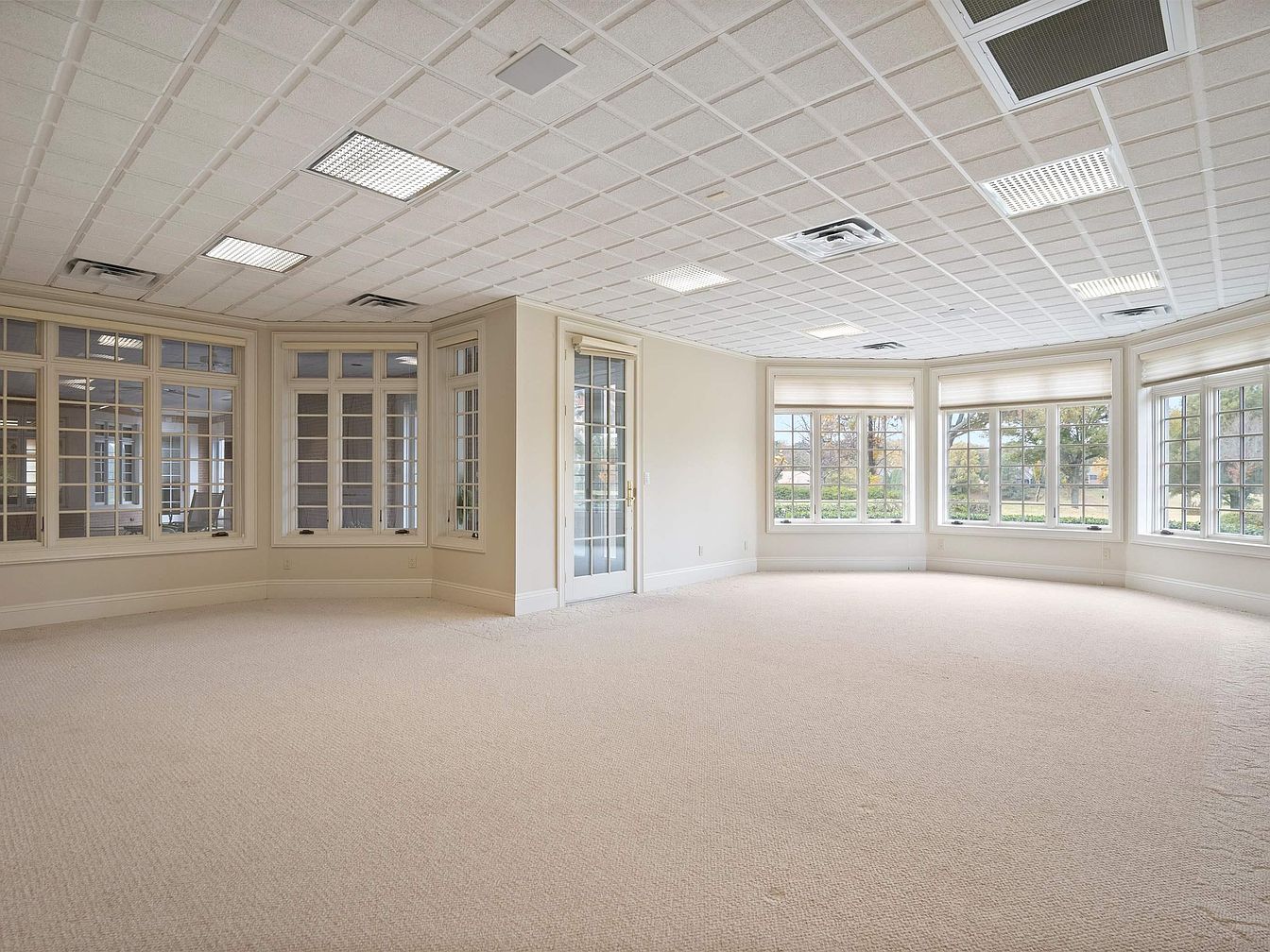 Expansive sunroom featuring wall-to-wall windows that allow an abundance of natural light to brighten the space, and offer panoramic views of the garden. The open layout and plush, neutral-toned carpeting create a welcoming area for children to play safely or families to relax together. French doors with decorative glass panels separate the space, adding an elegant touch. The ceiling’s grid pattern and recessed lighting give a modern yet cozy appeal. Soft beige walls complement the serene atmosphere, making this versatile room ideal for lounging, reading, or even hosting family activities in comfort and style.