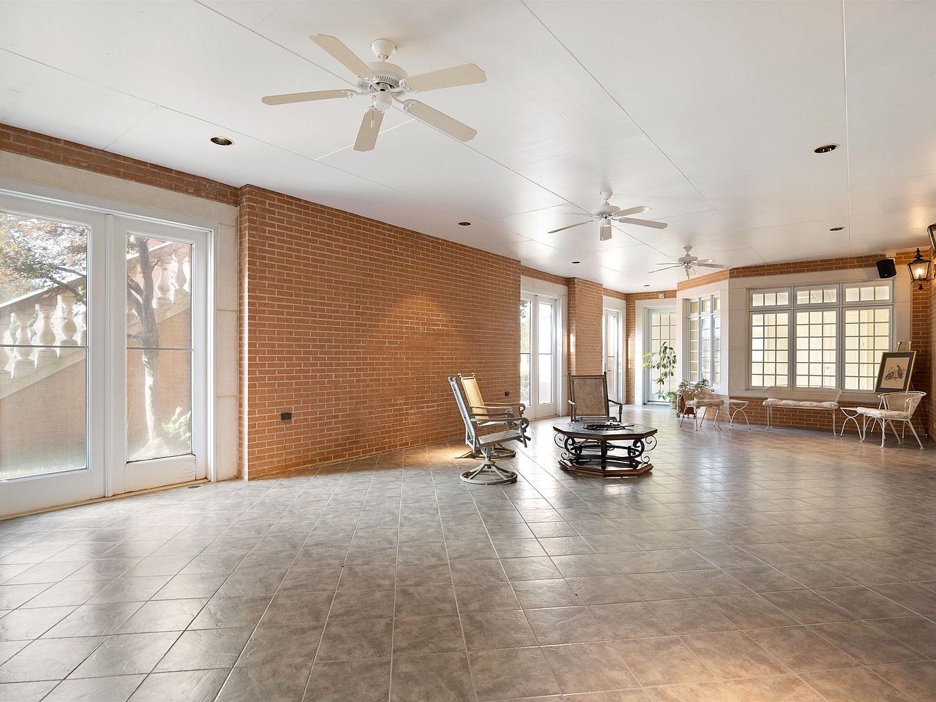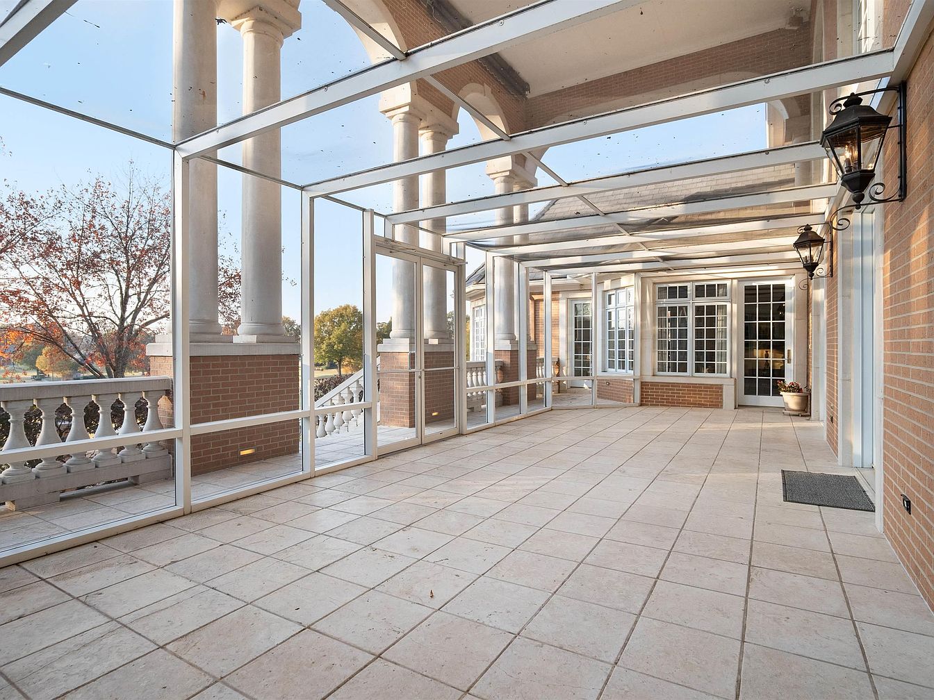Spacious tiled patio elegantly enclosed with glass and structured by classic white columns, offering a safe, open space ideal for gatherings and family activities. The area is bathed in natural light and enjoys views of landscaped trees, perfect for children to play while being supervised. Neutral stone tiles and warm brick walls create a welcoming palette, accentuated by large French doors and timeless black lantern lighting. The glass enclosure offers protection from the elements, making the space suitable for all seasons, while the balustrade and open layout maintain an airy, upscale ambiance perfect for entertaining or relaxing.