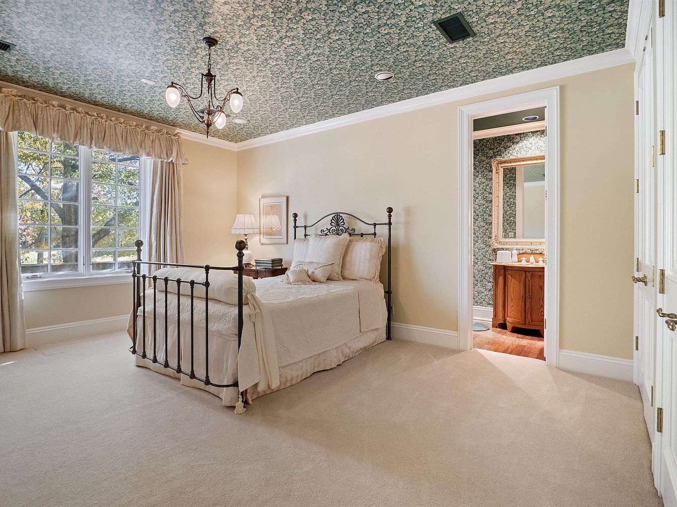 A cozy bedroom featuring a wrought iron bed frame and soft, neutral bedding creates an inviting and restful atmosphere. The expansive window lets in abundant natural light, while traditional cream-colored walls are paired with an enchanting leafy-patterned ceiling for a unique decorative touch. Plush, light carpeting adds comfort and warmth for family living. The room boasts elegant drapery and a timeless chandelier, blending classic elements with modern comfort. An ensuite bathroom is directly accessible, making the space practical for busy families. Tasteful wall art, a bedside lamp, and generous closet space complete this charming and functional retreat.