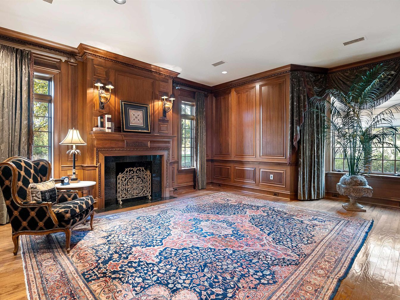 Warm wood-paneled walls create an inviting atmosphere in this elegant sitting area, anchored by a classic fireplace adorned with intricate detailing and overmantel sconces. Large windows let in abundant natural light, highlighting the rich tones of the polished hardwood floor. A lush, oversized plant brings a touch of nature indoors, while heavy drapery and a patterned area rug add sophistication and comfort. The plush upholstered chair paired with a side table is perfect for quiet reading or family gatherings, making the space both luxurious and welcoming for all ages. Tasteful artwork and decorative accents complete the timeless, family-friendly design.