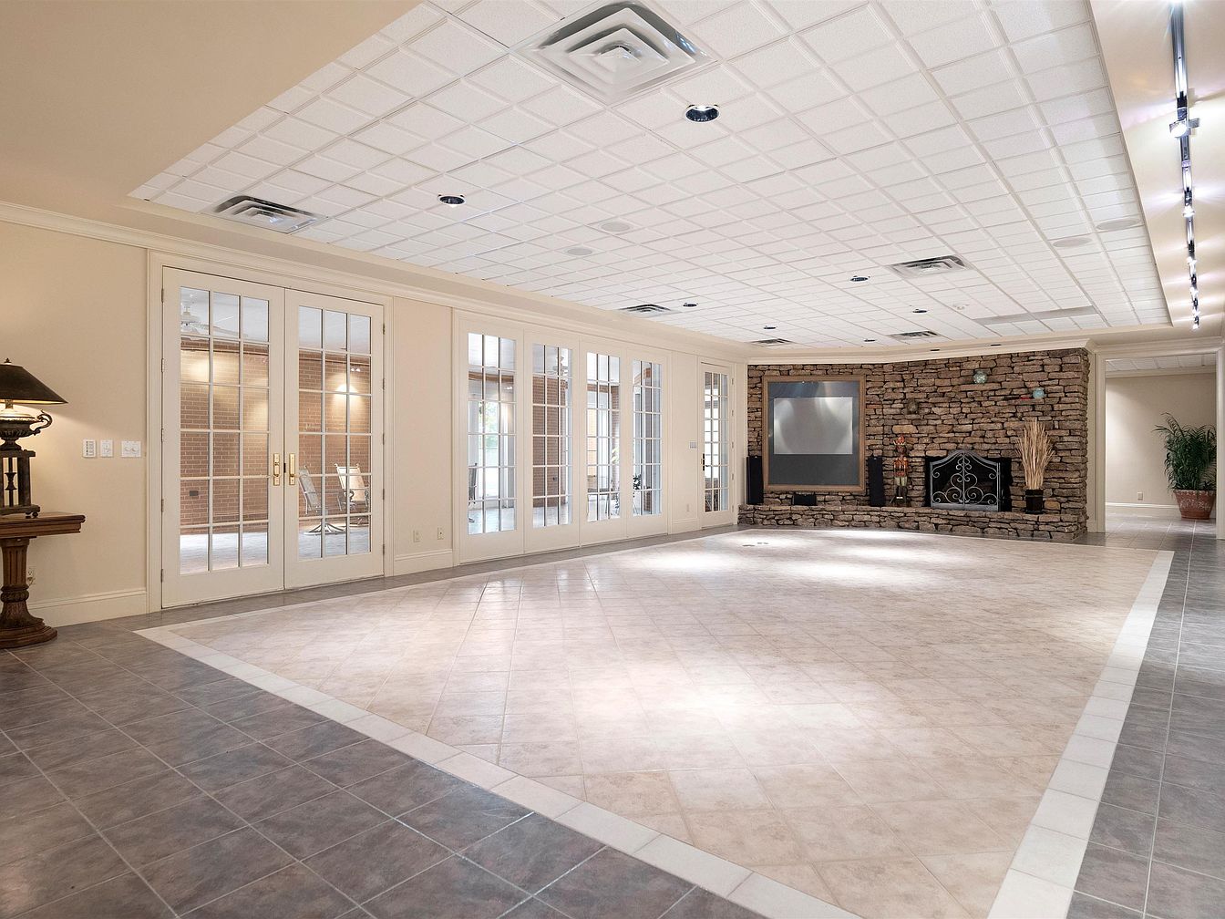 This expansive family room features a versatile open layout ideal for gatherings and play. The highlight is the stunning stone accent wall with a built-in entertainment center and fireplace, combining rustic charm with modern comfort. Floor-to-ceiling French doors allow natural light to flood the room and provide a seamless connection to adjoining spaces or an outdoor patio area. The light, neutral tile flooring is both durable and family-friendly, perfect for easy clean-up and comfort. Subtle recessed lighting, soft cream walls, and classic crown molding add an elegant touch, making this a welcoming retreat for family relaxation and entertaining guests.