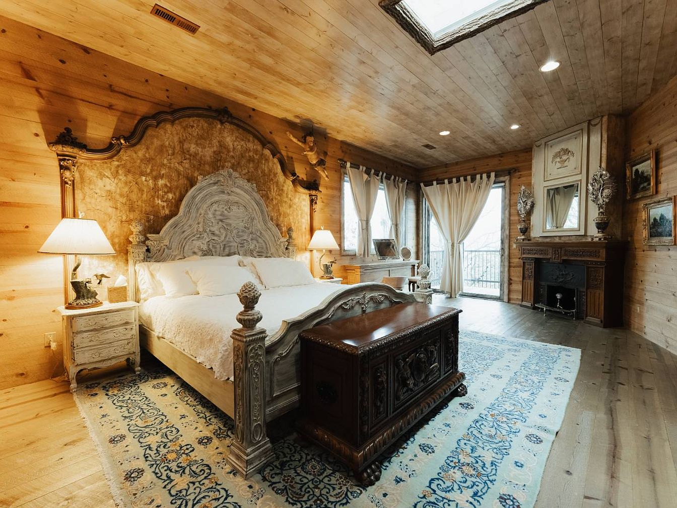 A spacious master bedroom showcases a harmonious blend of rustic warmth and luxurious classic design. The expansive wood-paneled walls and ceiling create a cozy, cabin-like ambiance, complemented by a skylight that fills the room with natural light. An ornate, antique-style bed with a carved headboard stands as the focal point, flanked by vintage nightstands and soft lighting. Family-friendly touches include ample floor space for play or added furnishings, alongside a plush area rug perfect for children. Elegant touches abound, from heavy drapes and a grand decorative fireplace to gilded mirrors and timeless artwork, offering both comfort and sophistication.