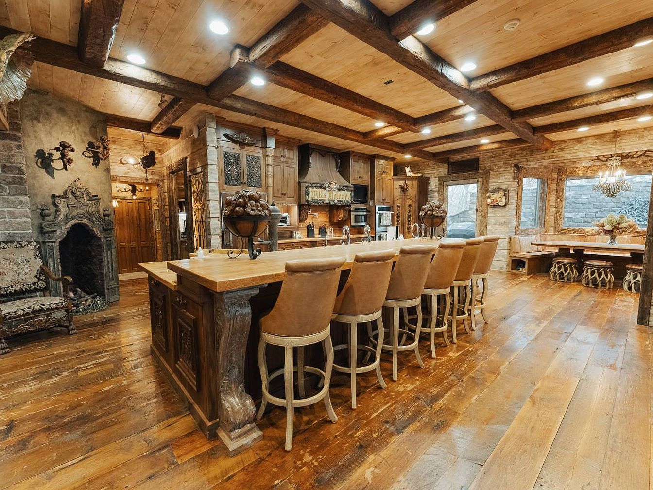 A warm, expansive kitchen seamlessly flows into a cozy dining nook, creating the perfect space for family gatherings and entertaining. Rustic wood beams frame the ceiling, echoing the wide plank wood floors, while the large island features carved details and is lined with plush, high-backed leather stools for casual seating. Earthy tones dominate the color scheme, complemented by a stone fireplace and ornate antique touches, adding historic charm. Built-in cabinetry provides ample storage, and the adjacent dining area boasts a custom banquet table set beneath a dramatic chandelier. Natural light pours in, making the space feel welcoming and family-friendly.