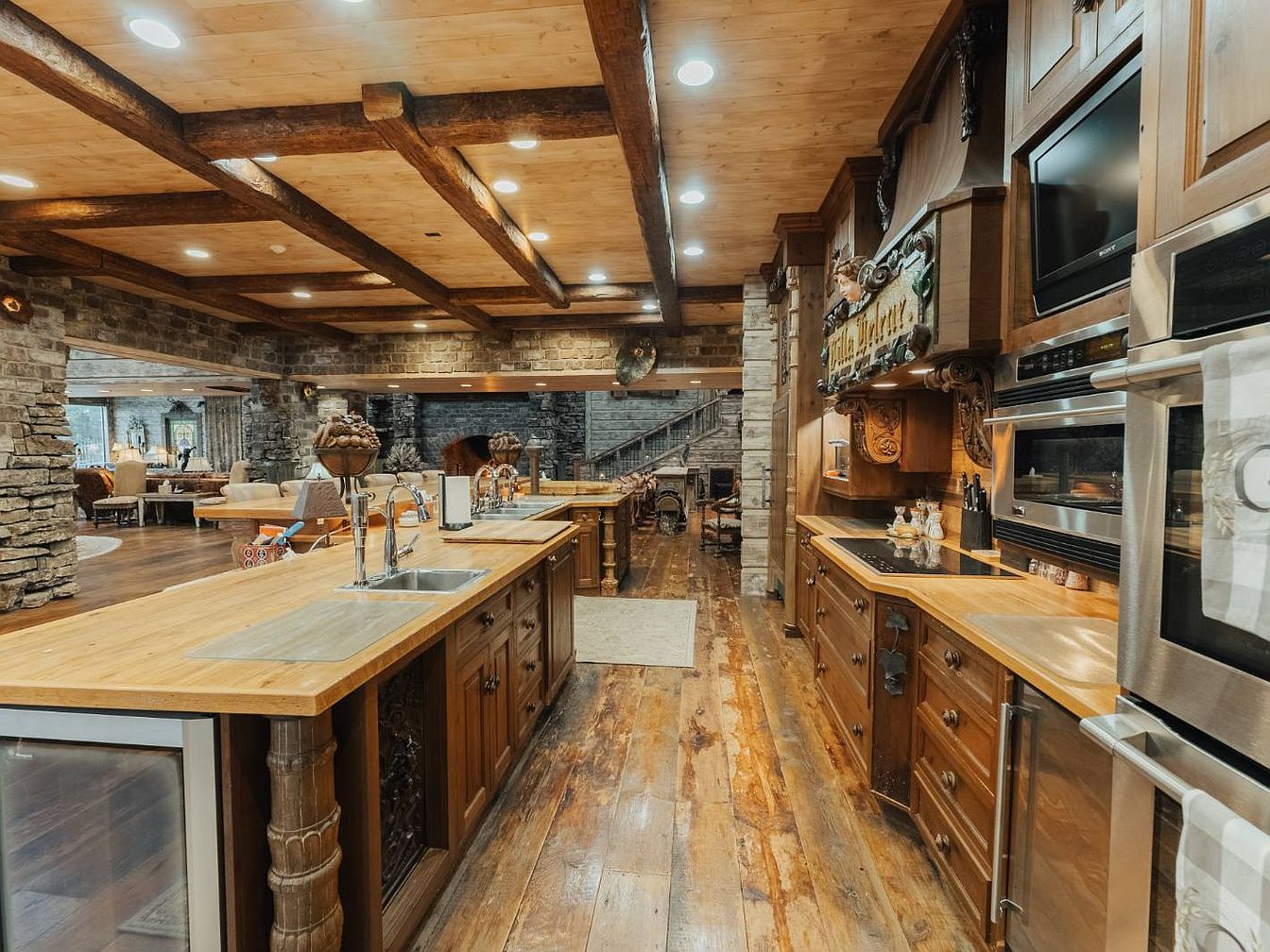 Warm wooden cabinetry, ceiling beams, and hardwood floors create a cozy, inviting atmosphere in this spacious kitchen. Stone walls and an open layout seamlessly connect the kitchen to the living area, making it ideal for family gatherings and entertaining guests. The expansive countertop island provides ample workspace and doubles as a social hub, with dual sinks and decorative turned wood supports. Modern stainless steel appliances blend with classic details, including ornate carved wood accents above the stove. Soft, neutral tones and abundant lighting enhance the welcoming feel, while the open plan encourages family interaction and easy supervision of children.