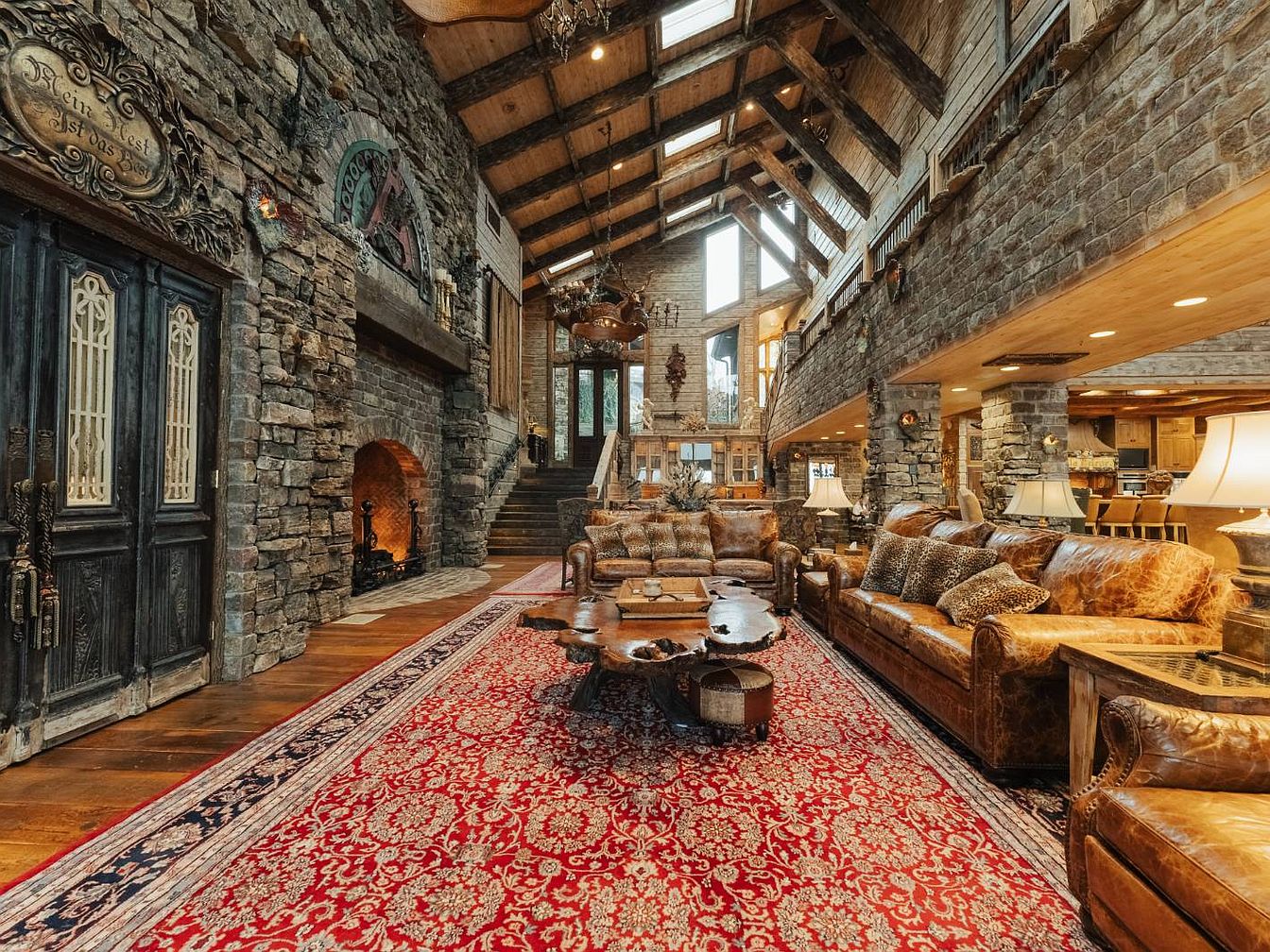 This spacious living room features soaring vaulted ceilings with exposed wooden beams and an abundance of natural light pouring in from clerestory windows. Walls of rustic stone frame a massive fireplace, creating a warm and inviting focal point for family gatherings. Plush leather sofas and armchairs are arranged around a striking wood coffee table, offering both elegance and comfort. A long, ornate red area rug adds color and coziness underfoot, while classic lamps provide soft lighting. The open floor plan seamlessly extends to the kitchen, making it ideal for family activities and entertaining guests in style.