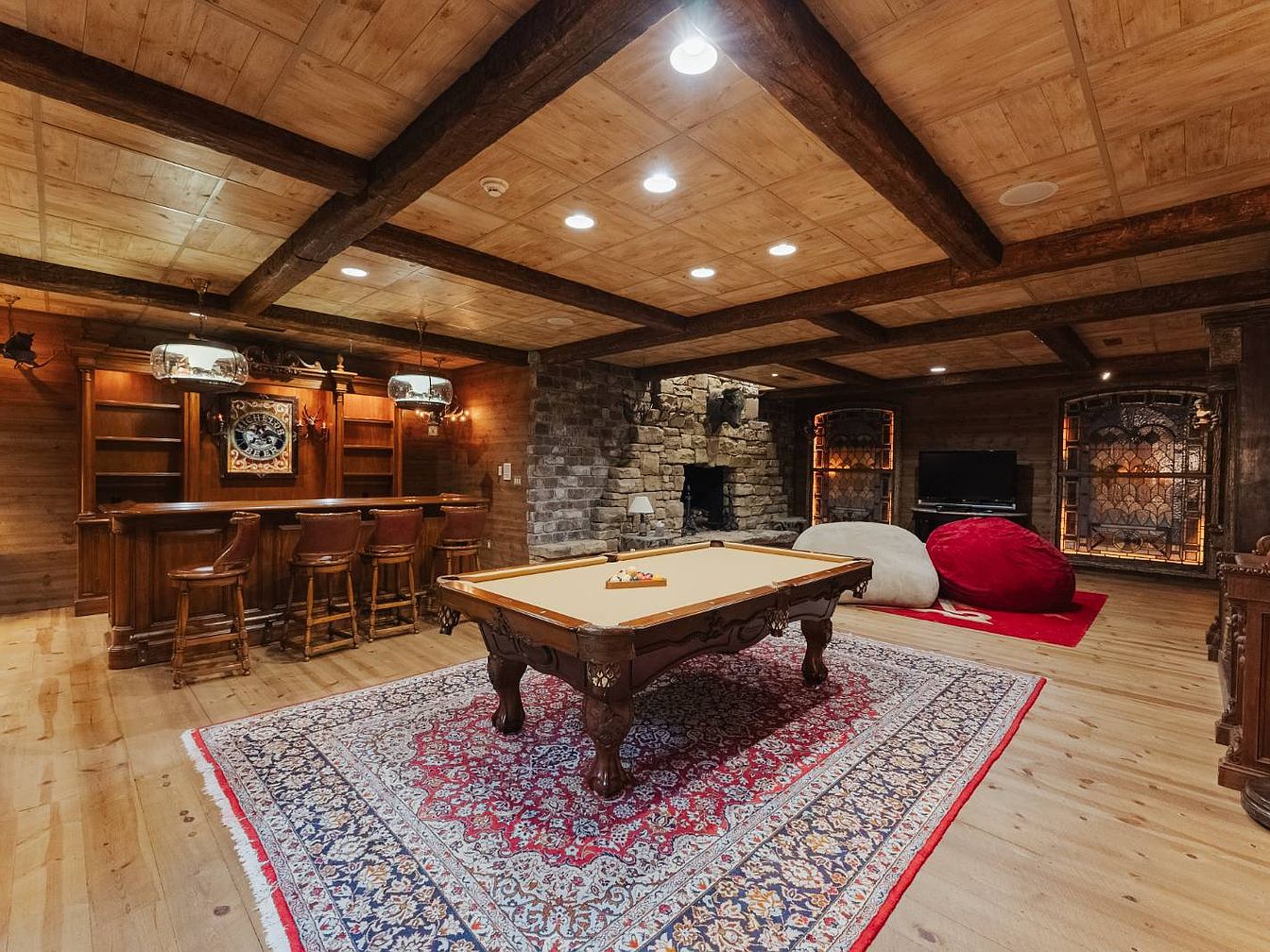 A spacious game room combines rustic elegance with cozy comfort, featuring natural wood beams across the ceiling and warm wood-paneled walls. The focal point is a classic pool table centered on a richly patterned area rug that adds a pop of color over the light hardwood floor. To one side, a built-in wooden bar with leather stools invites social gatherings, while a stone fireplace and entertainment area with plush beanbags create a welcoming family nook. Large stained glass windows, decorative lighting, and detailed architectural finishes give the space charm, making it ideal for family fun and relaxing evenings together.