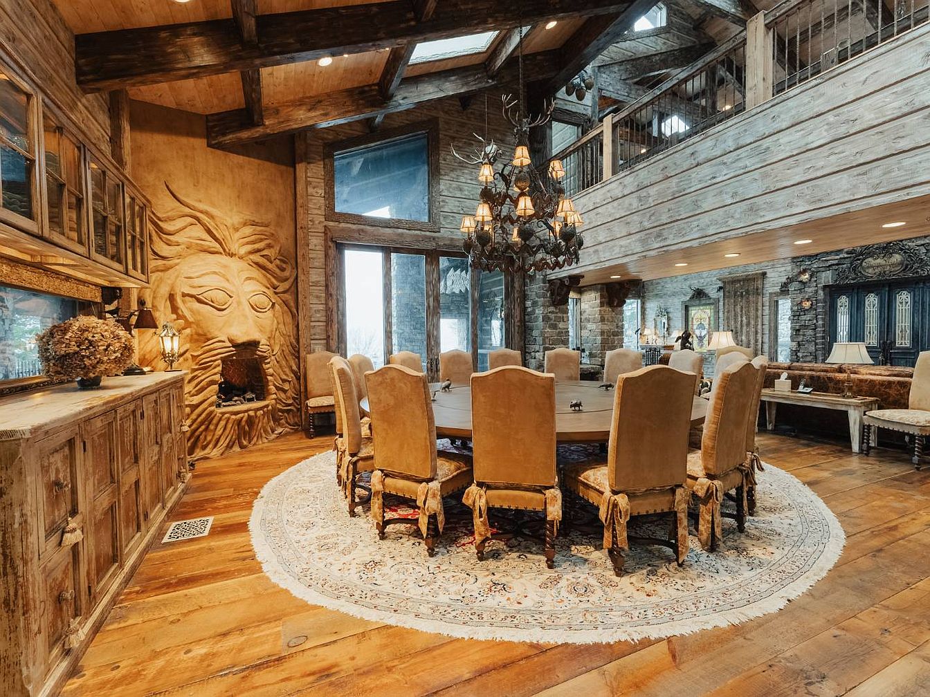 This spacious dining room combines rustic elegance with a sense of warmth and grandeur, ideal for family gatherings. A large round dining table with cushioned, high-back chairs sits atop a traditional patterned rug, providing a cozy setting for meals. The space is enveloped in natural wood tones, seen in the wide plank floors, paneled walls, and exposed wood beams. A striking sculpted lion’s head serves as a unique fireplace, creating a whimsical yet majestic focal point. Ample cabinetry and soft, ambient lighting complete the family-friendly design, offering both functionality and inviting atmosphere for shared moments.