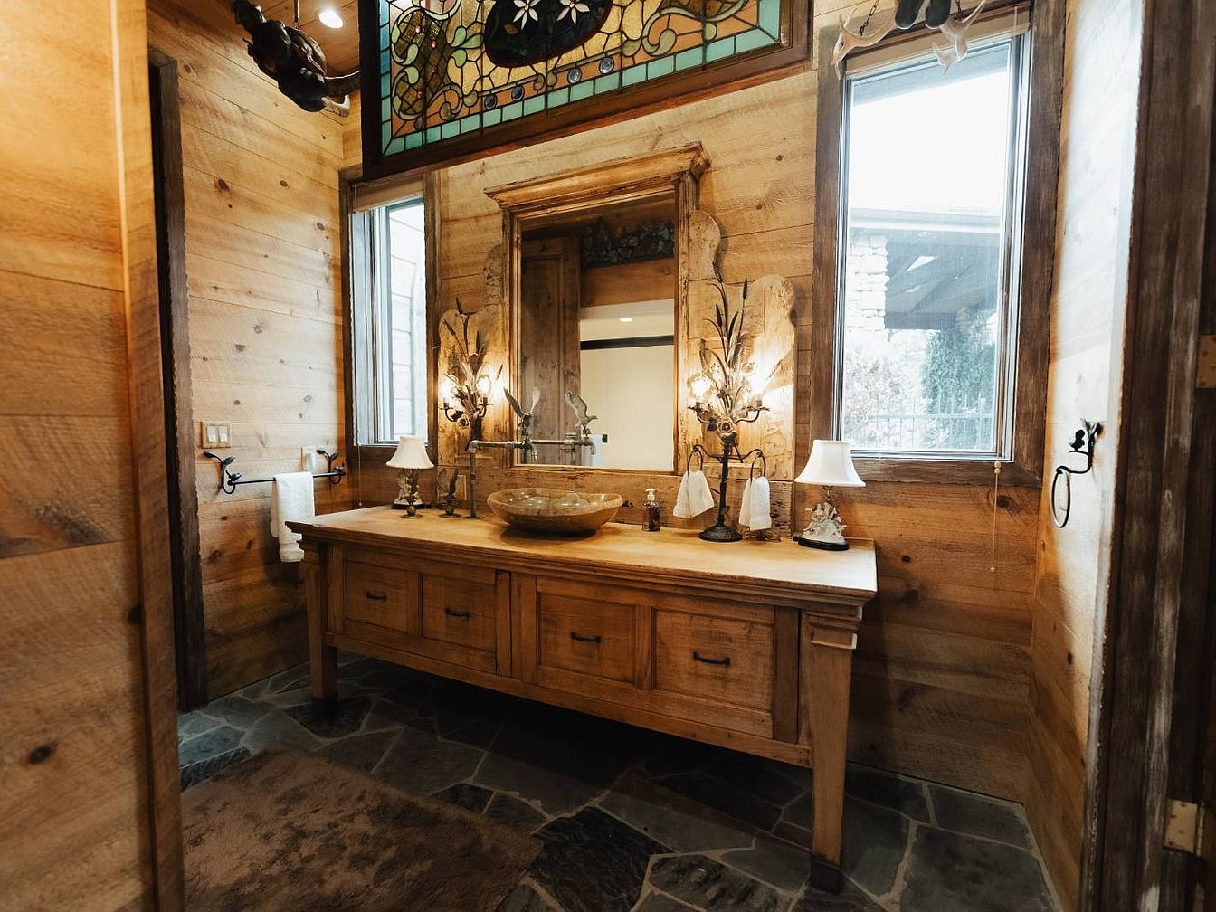 A warm and inviting bathroom featuring natural wood walls and a beautifully crafted wooden vanity topped with a unique vessel sink. Large windows frame the space, allowing for abundant natural light that enhances the cozy, cabin-like atmosphere. Decorative wrought-iron sconces and a stained-glass panel above the mirror add an artistic and whimsical touch. The dark stone flooring provides durability and a contrasting texture, making the room family-friendly and easy to maintain. Accents like vintage lamps and elegant hand towels offer a homey yet upscale feel, perfect for a comfortable and practical family retreat.