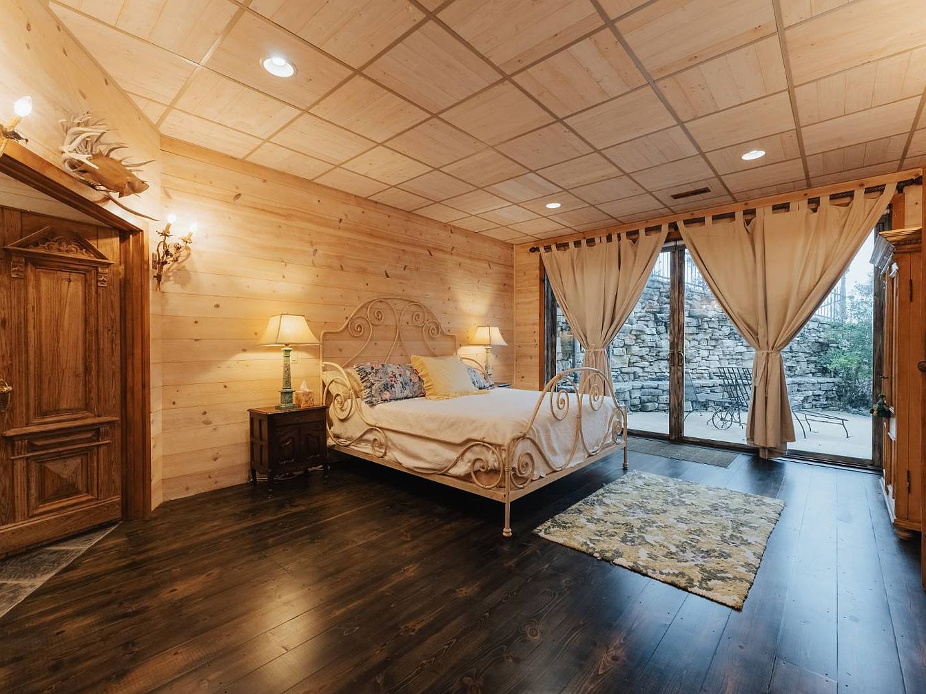 Warm wood-panel walls and ceiling create an inviting, cozy atmosphere in this spacious bedroom. A unique wrought-iron bed sits at the center, flanked by vintage-style bedside tables and soft lighting from elegant lamps. Open floor space enhances safety and comfort for family living, while expansive glass doors with floor-length curtains provide natural light and views of a stone patio, seamlessly blending indoor and outdoor living. The neutral tones of the wood are accented by a patterned rug and pastel pillows, and detailed woodwork on the door and furniture bring charm and character to this restful, nature-inspired sanctuary.