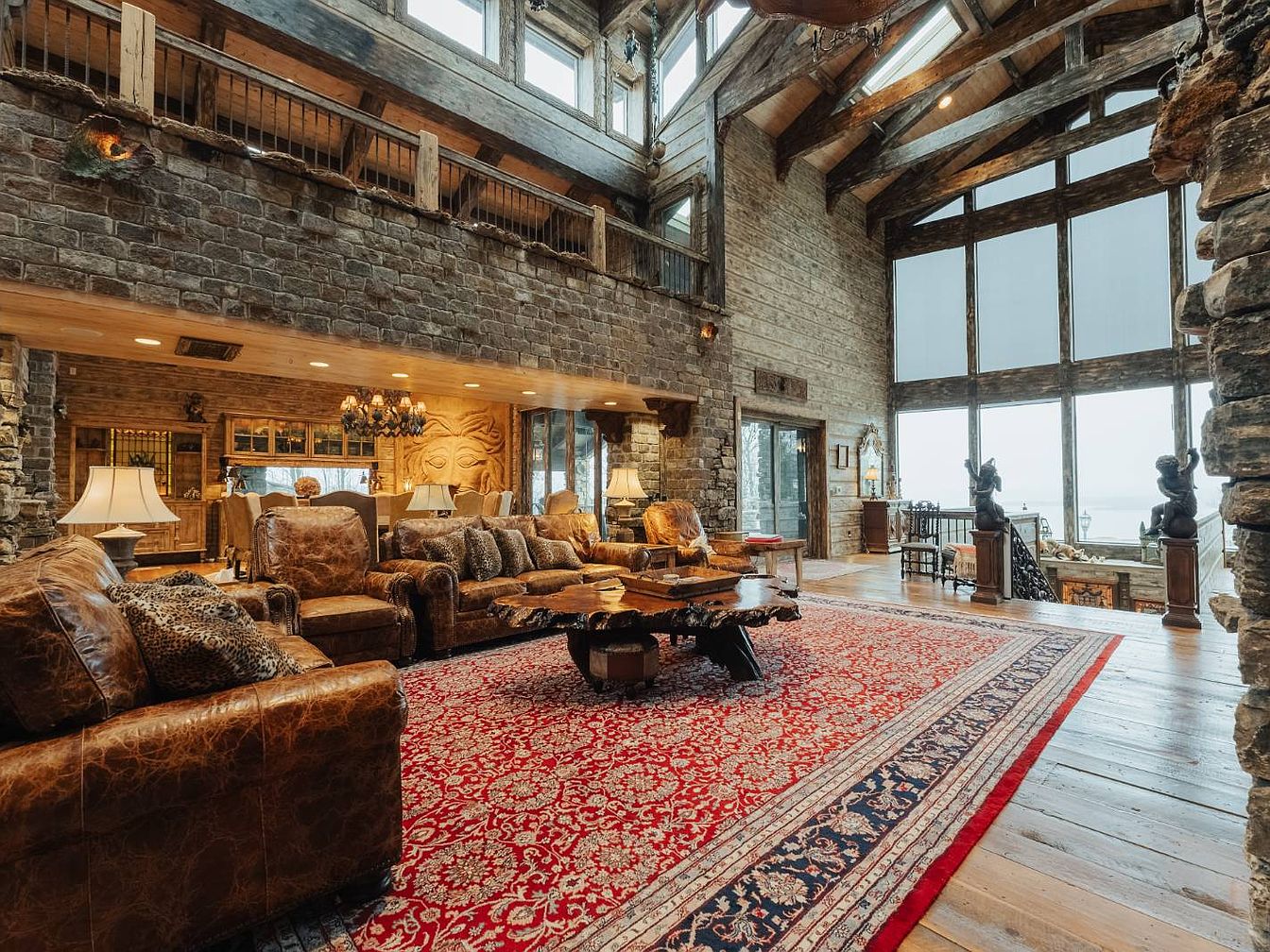 This spacious living room combines rustic charm with family warmth, featuring soaring ceilings with exposed wooden beams and a striking stone wall. Expansive windows invite natural light, enhancing the room’s inviting atmosphere. The seating area is anchored by a luxurious red Persian-style rug and complemented by plush, weathered-leather sofas and armchairs, perfect for family gatherings. A large, sculpted wooden coffee table sits center stage, adding an artisanal touch. Decorative lamps, animal-print pillows, and whimsical bear statues contribute to the room’s cozy, lodge-inspired aesthetic. The open layout and visible staircase encourage easy movement, making it ideal for both relaxation and entertaining.