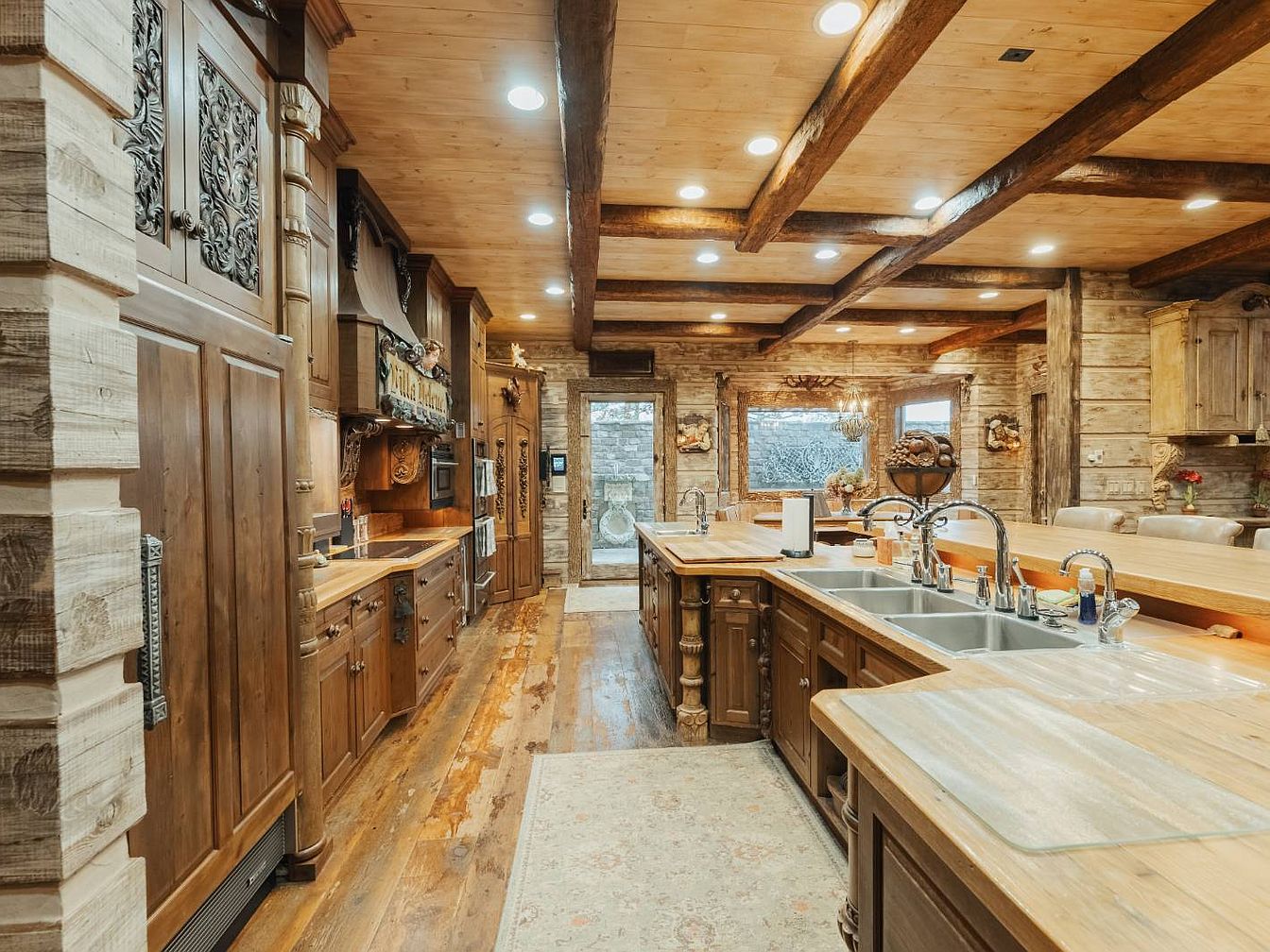 This spacious kitchen combines traditional rustic charm with modern functionality, featuring gorgeous exposed wooden beams and custom cabinetry with intricate carvings. A large kitchen island with ample seating and dual sinks offers plenty of space for meal prep, family gatherings, and entertaining. Natural wood tones are complemented by warm recessed lighting and a neutral, textured rug, creating a welcoming and cozy atmosphere. The open layout allows views to a bright breakfast nook beside wide windows. Family-friendly touches like generous counter space and easy-to-clean surfaces make this kitchen both beautiful and practical for day-to-day living.