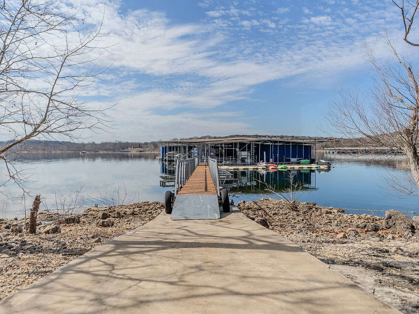 A gentle concrete pathway leads directly to a wooden dock, creating a seamless transition from the rocky lakeshore to the tranquil water’s edge. This outdoor feature is perfect for families who enjoy water activities, offering accessible entry for boating, kayaking, or fishing. The dock is adjacent to a covered marina with vibrant kayaks and paddleboards visible, adding a splash of color against the serene blue of the lake. Bare trees frame the space, enhancing the natural, rustic charm, while the open sky and calm water set a peaceful mood, perfect for both relaxation and outdoor gatherings.
