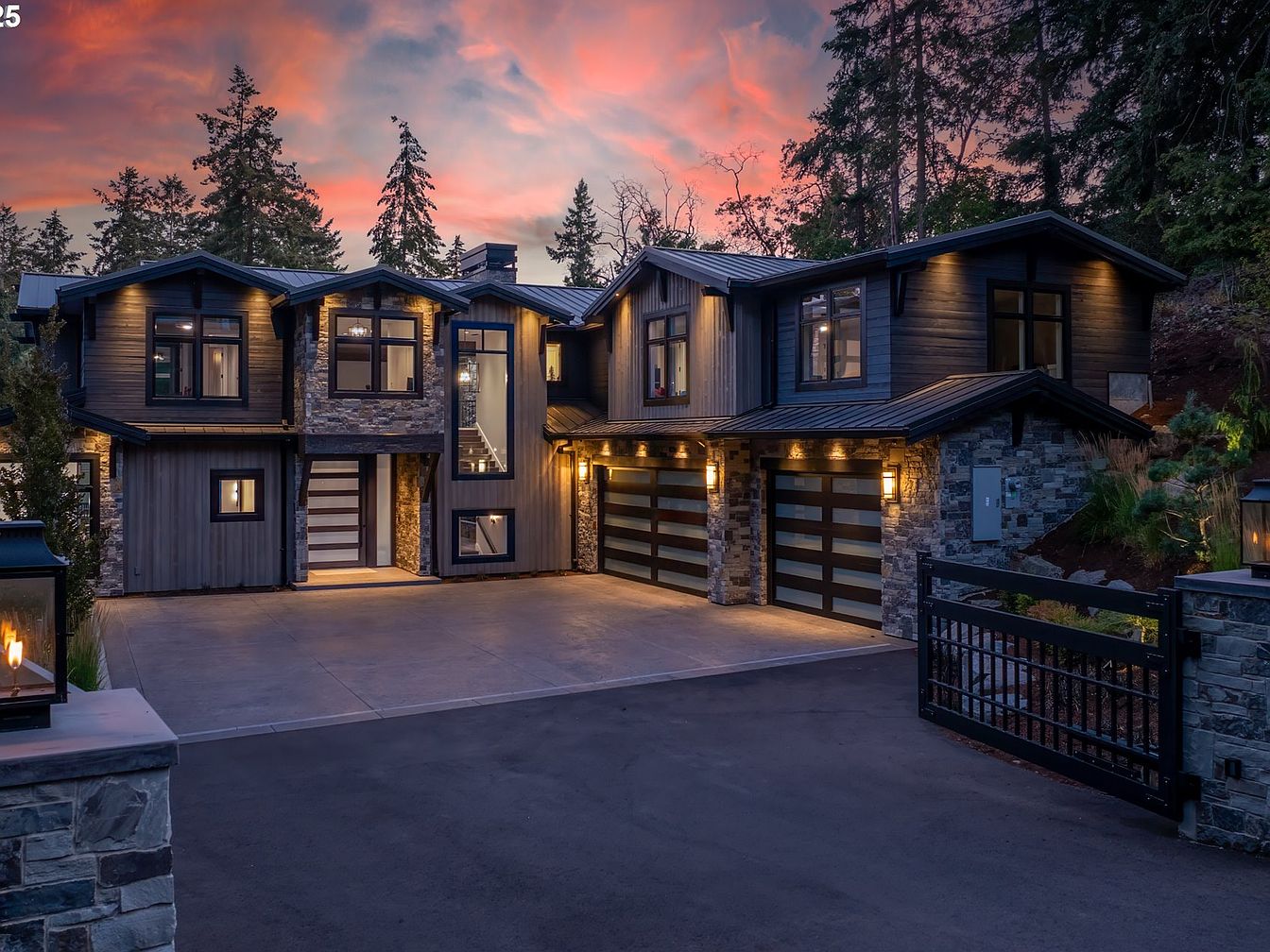A striking contemporary home exterior nestled amidst tall evergreens, blending natural stone with dark wood siding and sleek lines for a sophisticated and welcoming look. Expansive windows provide plenty of natural light and showcase the multi-level layout, making the house ideal for families. Warm exterior lighting accents the architectural details, illuminating the three-car garage and inviting entryway. The wide driveway and secure gate enhance both convenience and privacy, while landscaped plantings soften the space. The robust color palette of grays and rich wood tones reflects a modern yet cozy charm, creating a perfect setting for comfortable family living.