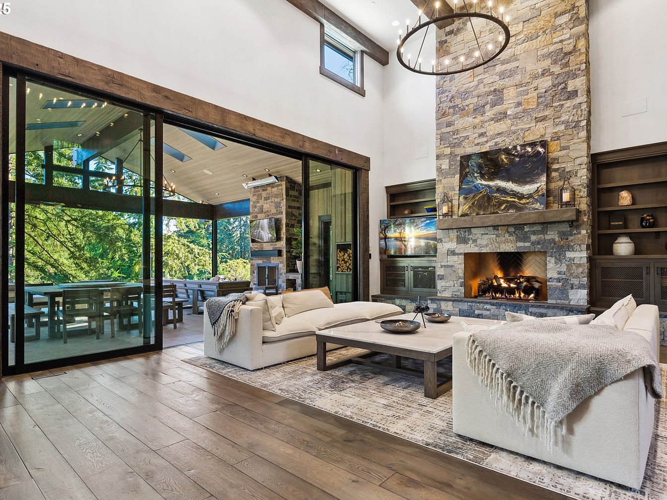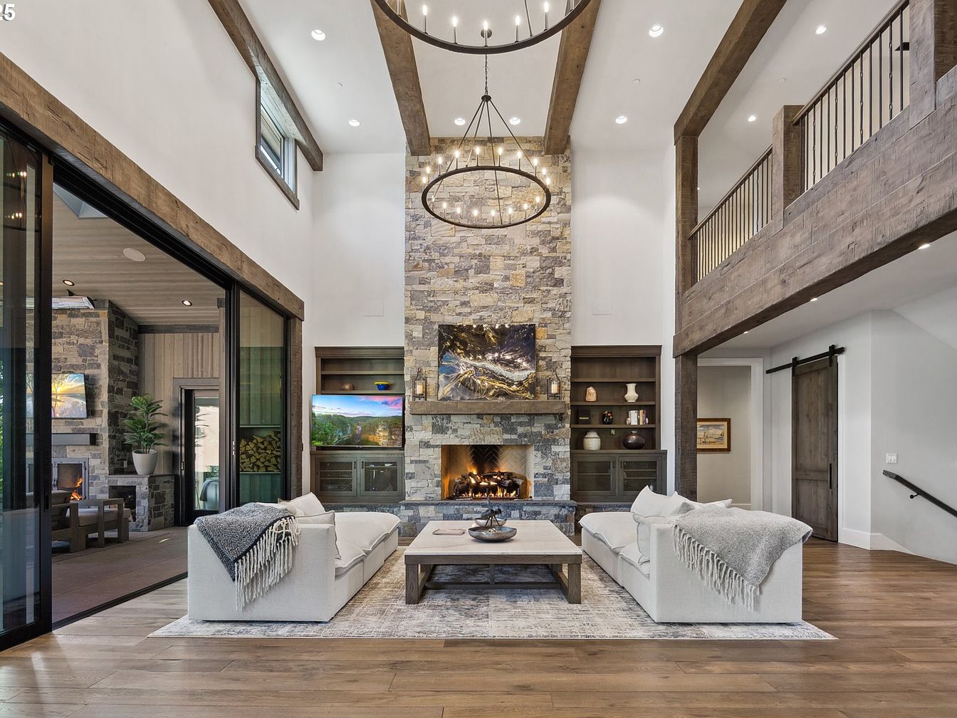 A stunning, open-concept living room features a soaring stone fireplace crowned by a dramatic, modern chandelier. Expansive glass doors seamlessly connect the cozy indoor seating area with the spacious outdoor patio and dining zone, perfect for family gatherings or entertaining. Soft, neutral-hued sofas and a large central coffee table provide ample space for relaxing or playing games together. Warm wooden floors and accent beams complement custom built-in shelving, creating a welcoming atmosphere filled with natural light. Earthy tones and plush textiles add softness and comfort, while the elegant yet practical design makes it ideal for both daily family life and special occasions.