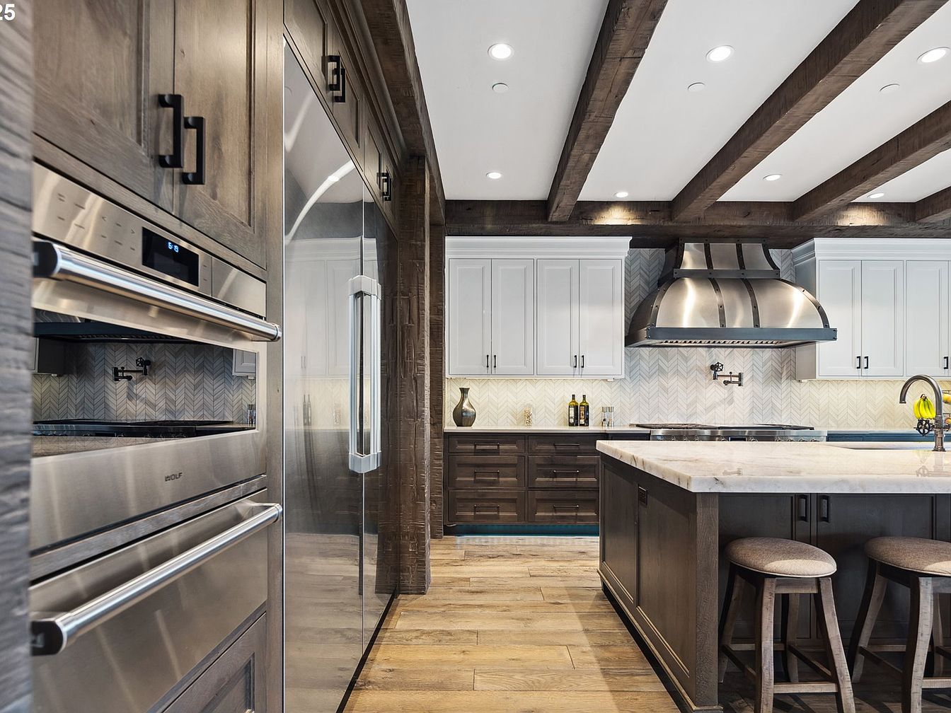 A spacious, family-friendly kitchen features a large central island with seating for casual meals or homework sessions, perfect for busy households. The design combines rustic and modern elements, highlighted by rich wood cabinetry, exposed ceiling beams, and a sleek stainless steel range hood. Light wood flooring complements the airy, neutral color scheme, while a chevron-patterned tile backsplash adds visual interest. Ample storage options, double ovens, and a generous refrigerator ensure convenience for family cooking and gatherings. The durable stone countertops and soft under-cabinet lighting contribute to a warm, inviting atmosphere ideal for daily life and entertaining guests.